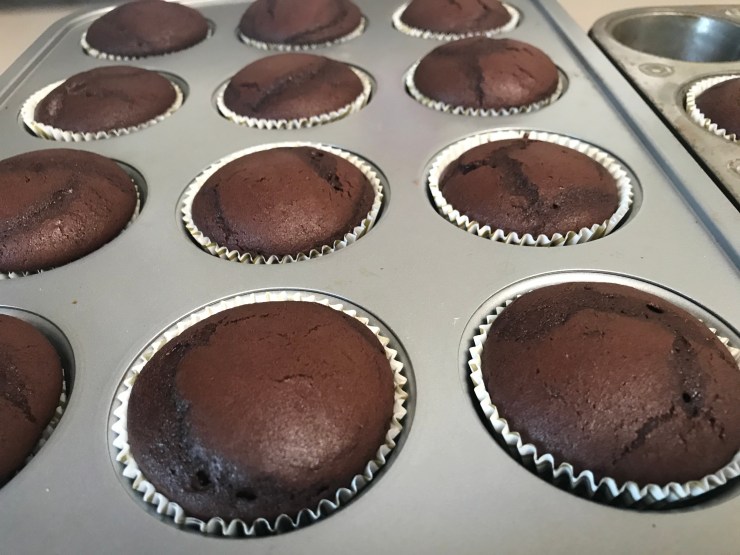 Bake at 350 for 18-20 minutes, or until a toothpick inserted comes out dry, with just some crumbs. Transfer the tin to a wire rack to cool. Once the rack is cool enough to tough (probably just a few minutes), take the cupcakes out of the tin and let them cool on the rack by themselves.