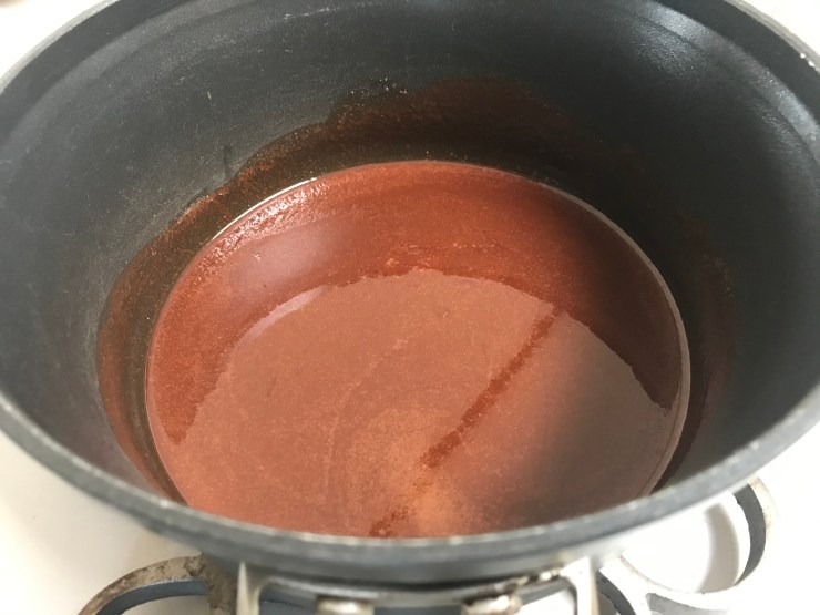 Take the pot off the heat and add in the sugar. Whisk that until it’s well blended. Next, do the same with the cocoa powder – add in and whisk until well blended.
