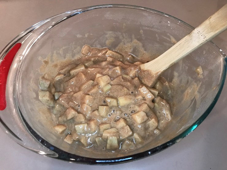 Add the apples into the batter and mix with a wooden spoon until they are evenly distributed throughout.