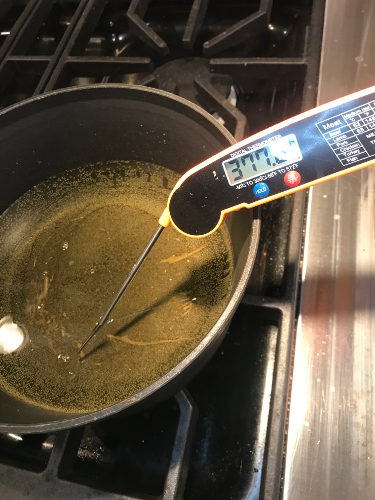 Heat the oil to 375 degrees. Here, you’ll need a thermometer for this. It needs to be this hot for the fritters to cook all the way through – too cold and they’ll cook on the outside and be raw on the inside…too hot and they’ll burn.