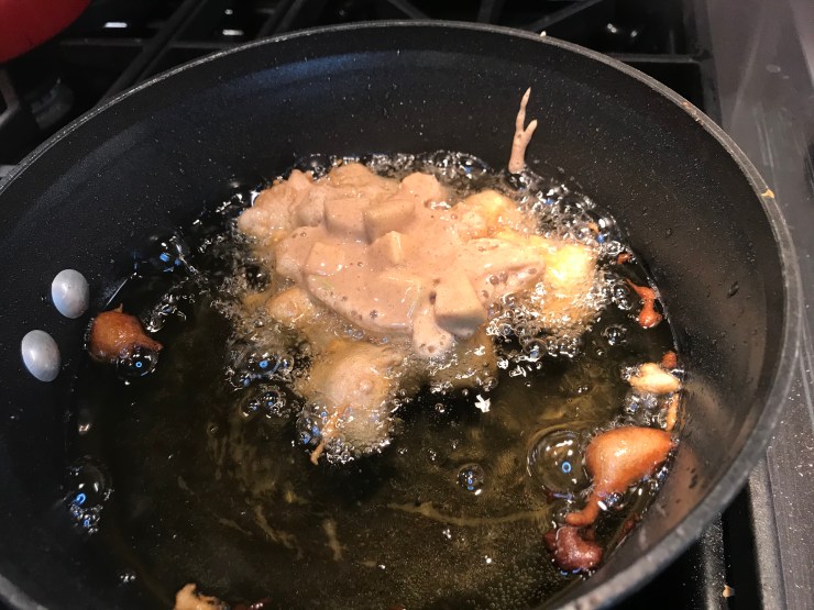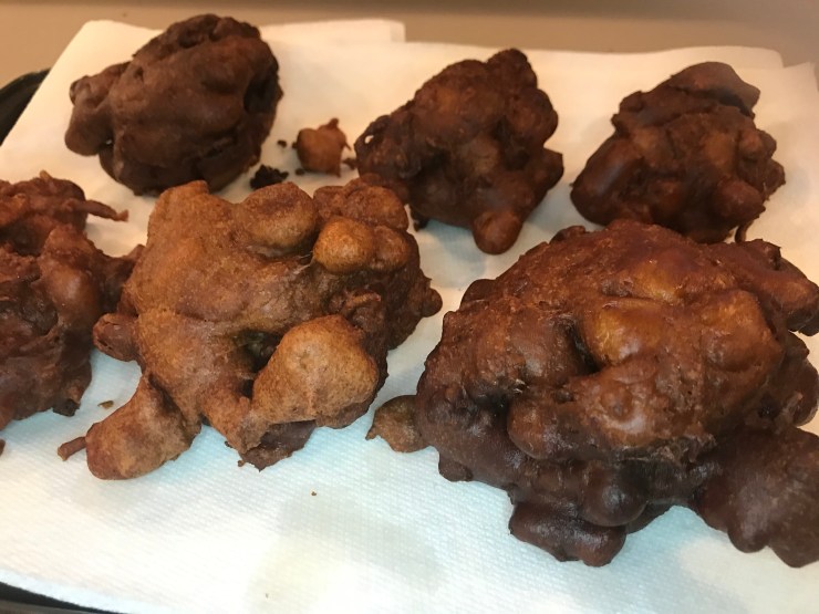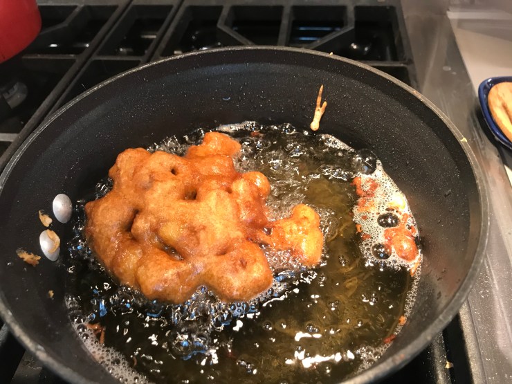 When your oil is hot enough, take large wooden spoonfuls of the batter and put them into the oil. You’re shooting to make six of these, so eyeball about how big each should be. BE CAREFUL! The oil is hot (375 hot to be exact) and may splash when you put the dough in. You don’t want it to splash on you, because pain hurts.