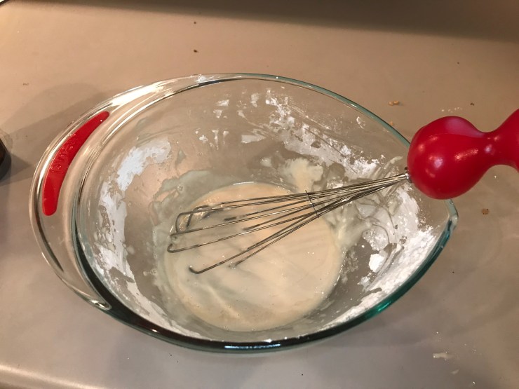 While the fritters are draining and cooling, you can make the glaze. Like most glazes this is super-simple – just pour all three ingredients (powdered sugar, milk, vanilla) into a smallish bowl and whisk together until smooth.