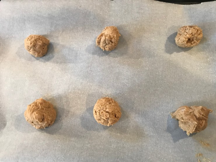 When you’re ready to bake, get your dough out of the fridge and roll it into balls about the size of a ping pong ball. Place the dough on a cookie sheet lined with parchment paper, 6 to a sheet. NOTE – the batter will be very sticky! Roll the balls fast and put the batter back into the fridge between each round.