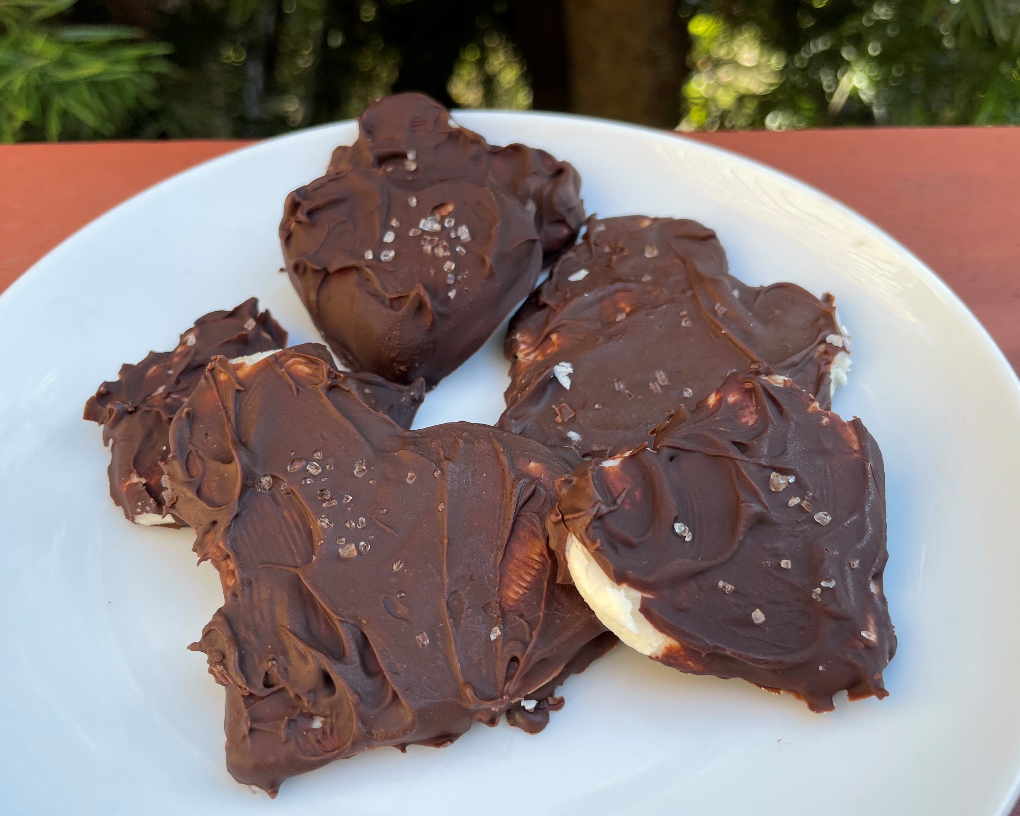 Take your cookie sheets out of the fridge and dip each pattie into the melted chocolate. Get it fully covered, remove it from the chocolate with a fork and put it back onto the cookie sheet. Do this with all the patties, then lightly sprinkle each with a little sea salt.