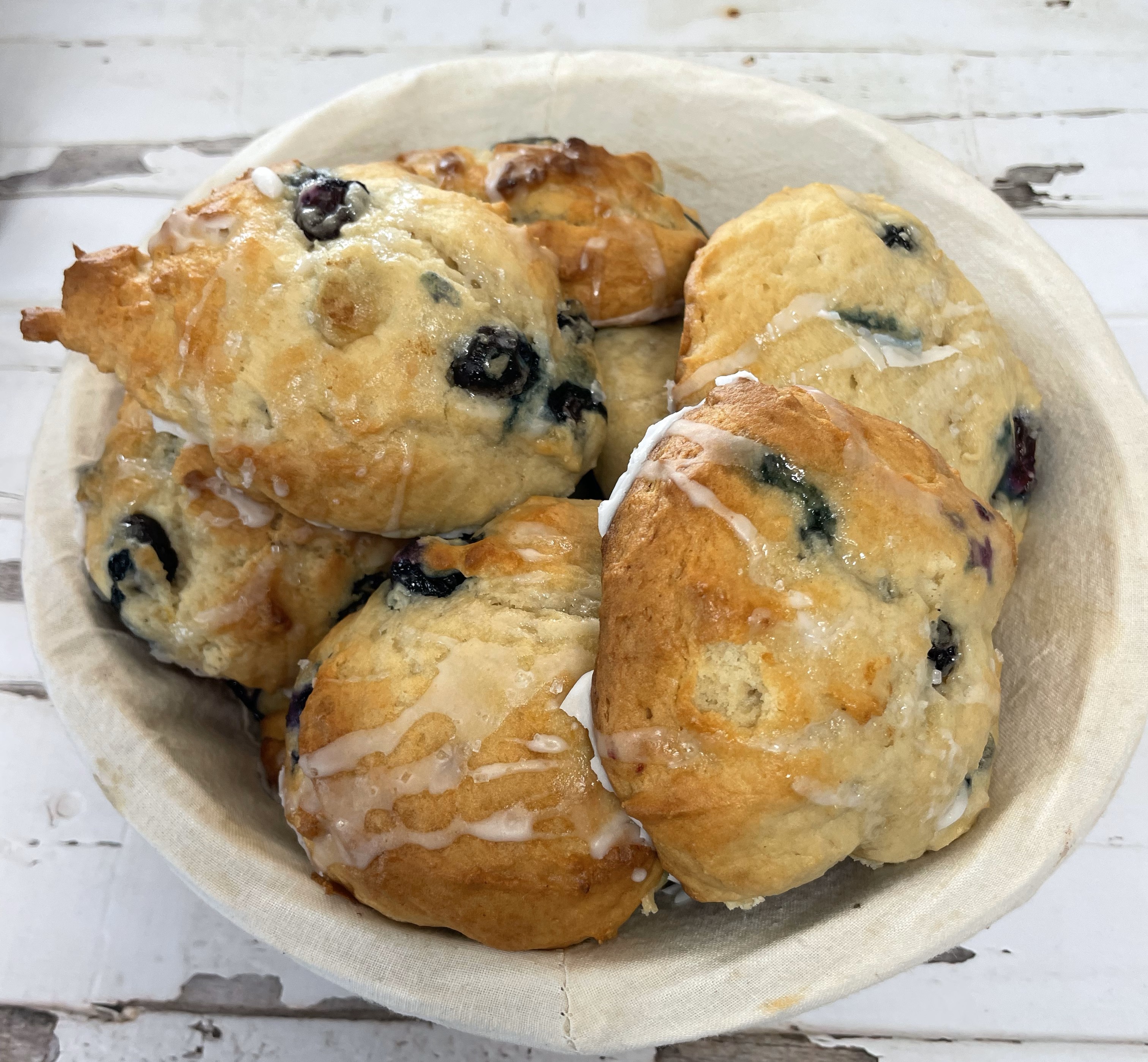 And this recipe helps me whittle away at my over-abundance of blueberries! In a separate, larger bowl put the lemon yogurt, egg, butter and vanilla. Mix until just combined. Get your flour mixture and slowly add that into your yogurt and egg mixture and once again mix until just combined. Finally, pour in your blueberries and stir (don’t mix) until they are evenly distributed. Line your baking sheets with parchment paper and plop your dough onto the sheets, six to a sheet. You’ll want these larger than, say, a cookie – about a third of a cup maybe. You’ll be making a dozen biscuits, so portion your dough accordingly. You can always add a little more to some if you need to. Bake at 400 for about 15 minutes, or until they are a nice golden brown color. When they get there, remove the sheets from the oven and transfer them to a wire rack. Leave the biscuits on the sheets for about 5 minutes, then take them off and let them cool completely on the wire rack. Once they’ve cooled down, you can make the glaze. (Actually, you can glaze them when they’re a little warm if you want to enjoy them warm, but you don’t want them too hot – otherwise the glaze will just slide off.) In a small bowl add the powdered sugar and some of the milk. You might not need all of it – you want to add it a bit at a time and whisk after each addition until you get the glaze to a consistency you like. Move the biscuits to a sheet of wax or parchment paper to make this easier to clean. Drizzle the glaze on the biscuits then, if you like, sprinkle on some chunky sugar. It’s not required, but looks nice and adds a little extra bit of crunch. This recipe makes a dozen dessert for breakfast biscuits!Ingredients