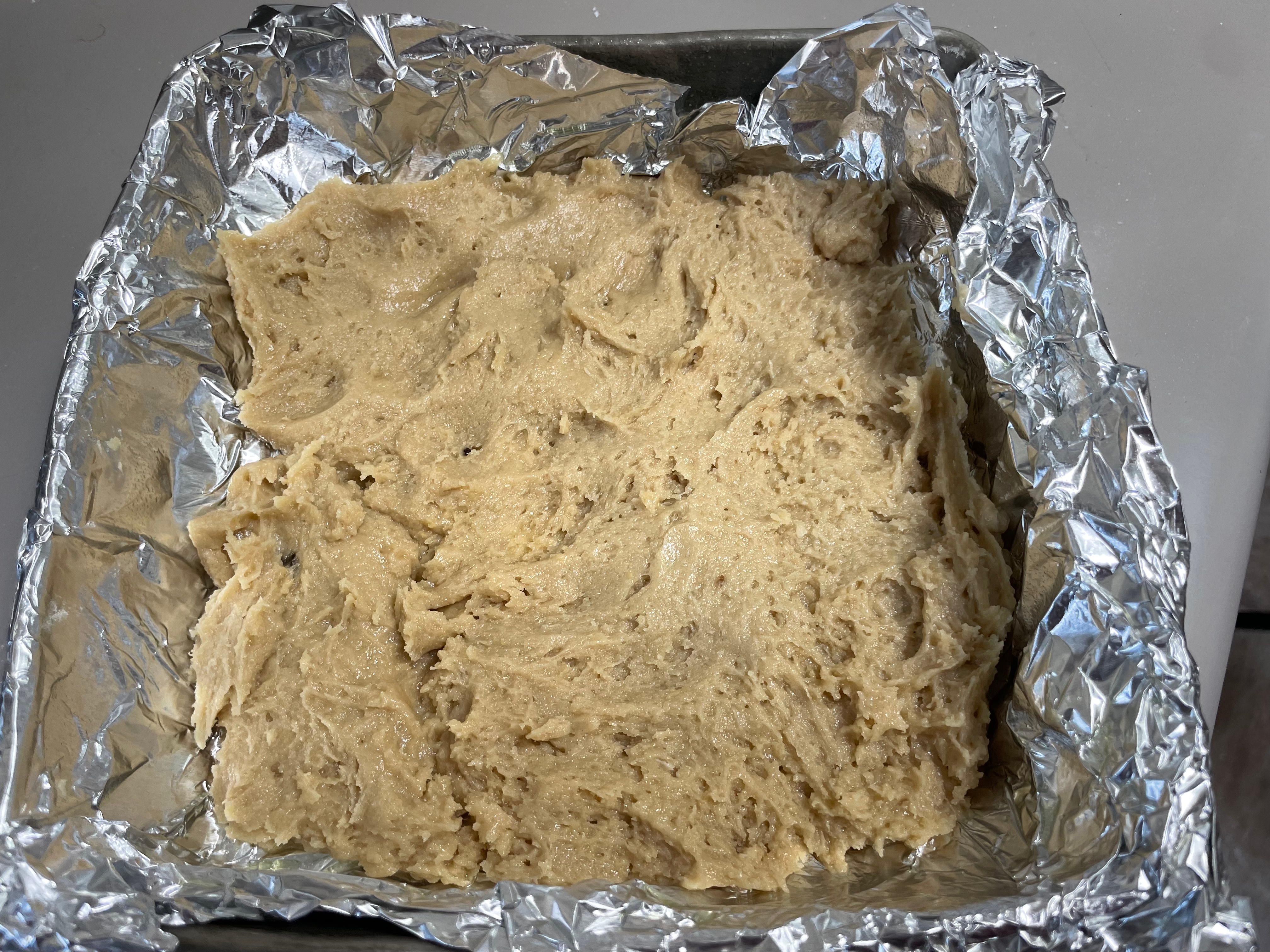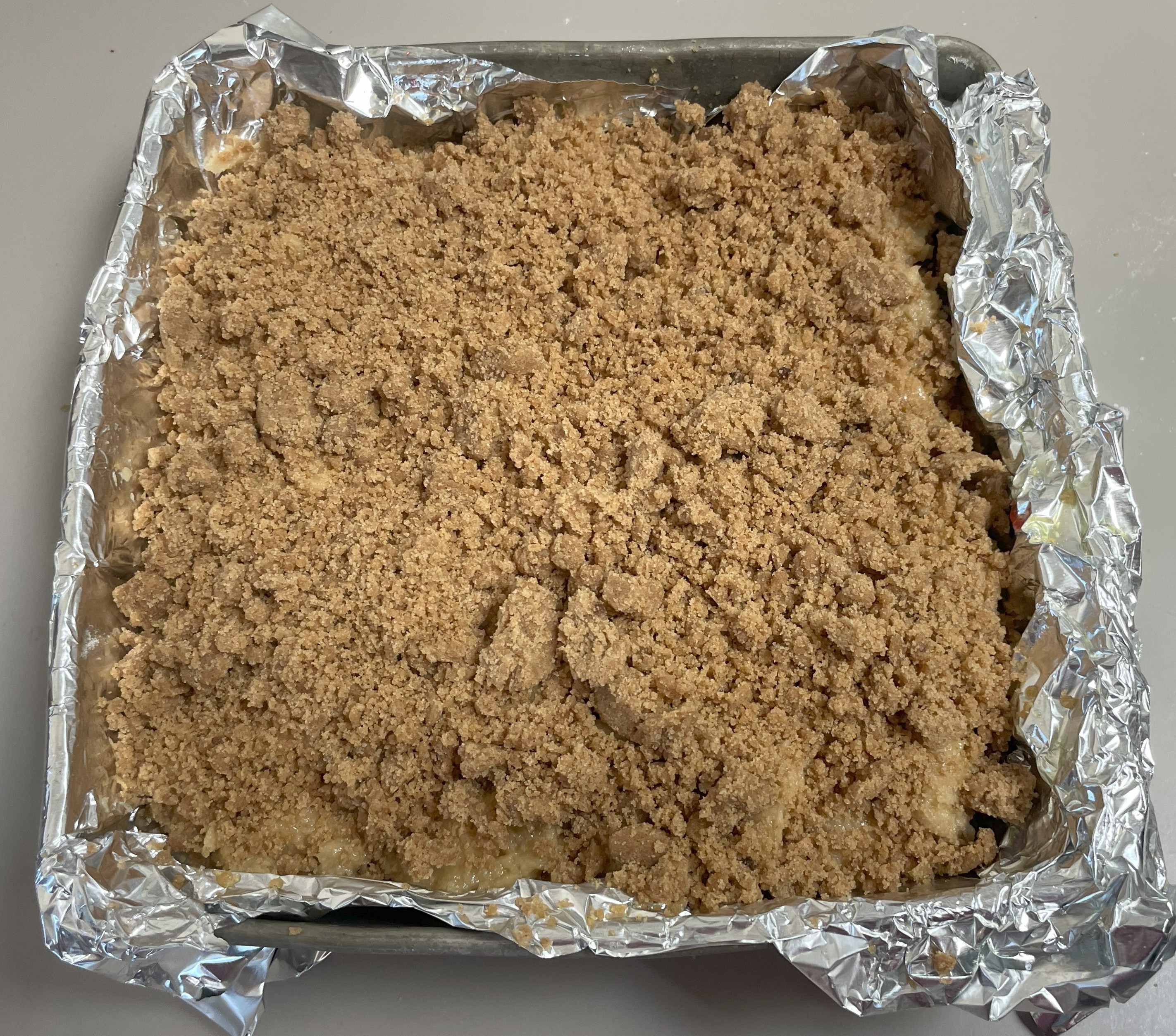 Get and 8” or 9” square pan and butter and flour or line with aluminum foil and spray. I almost always use the foil option – it’s just easier to clean things that way. Set this aside.Now on to the actual cake, and we’ll start with the crumble.