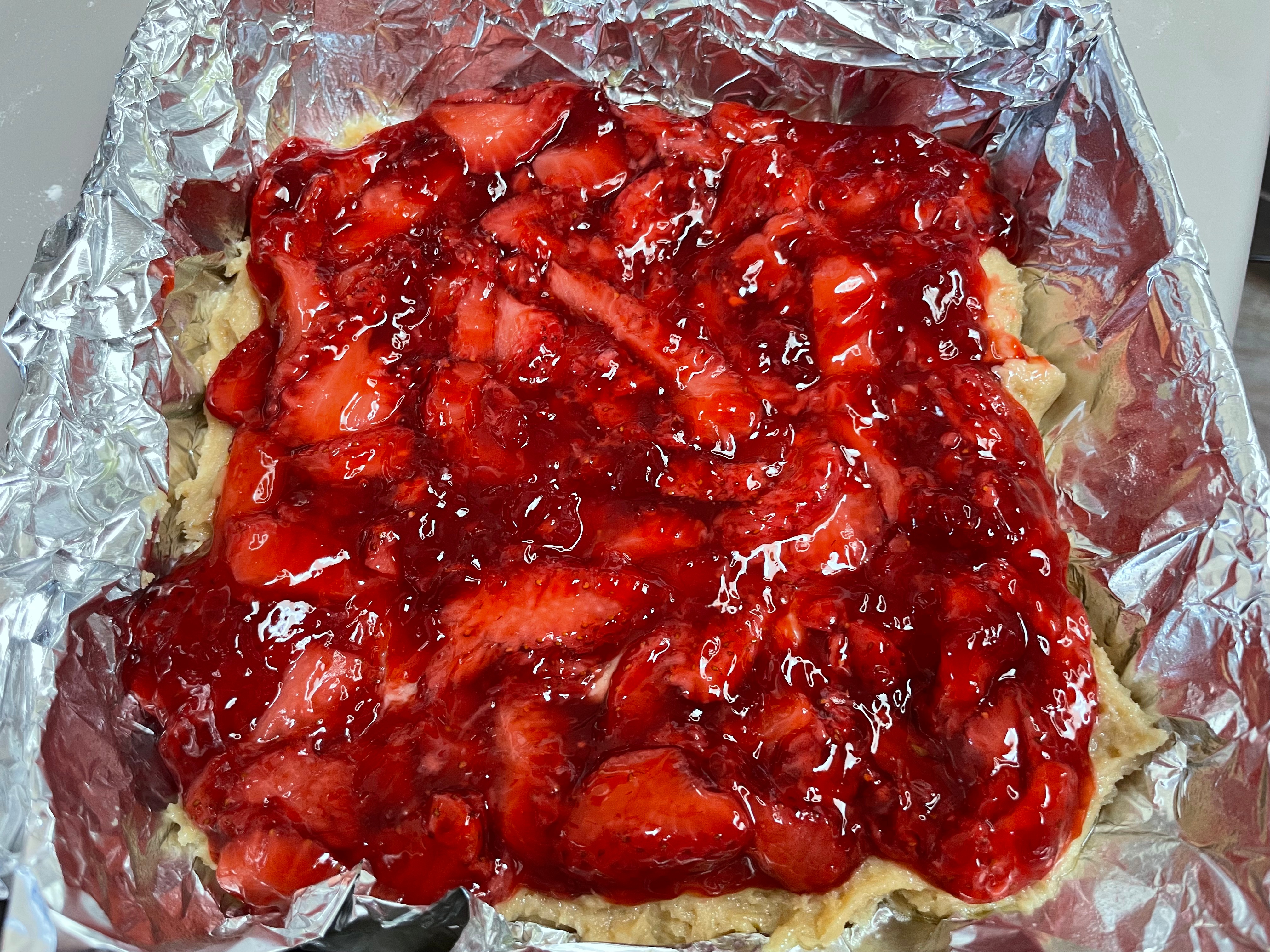 Next, get your strawberry mixture (it’s ok if it’s still warm – it probably will be) and spoon that over the batter, as evenly as you can.