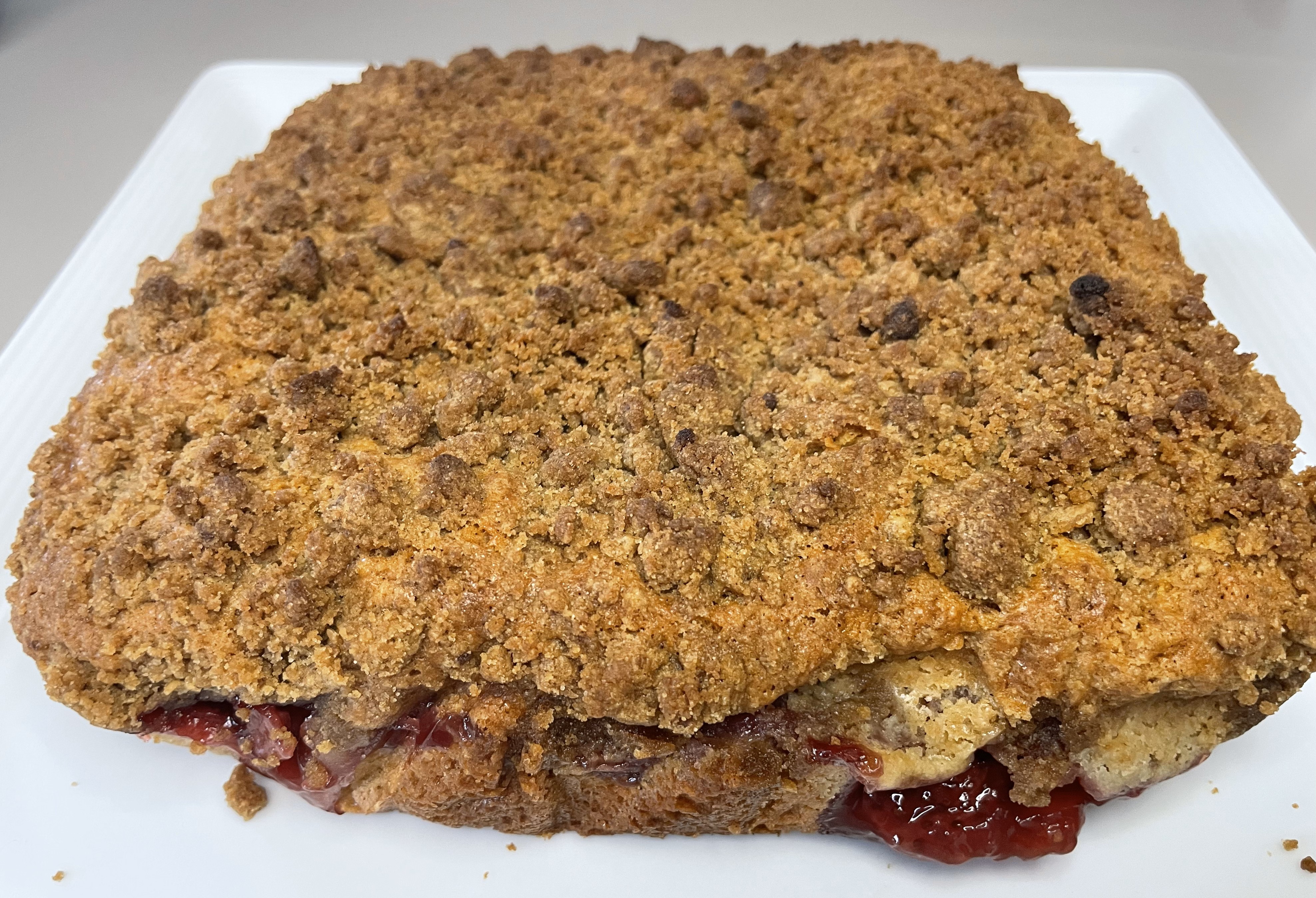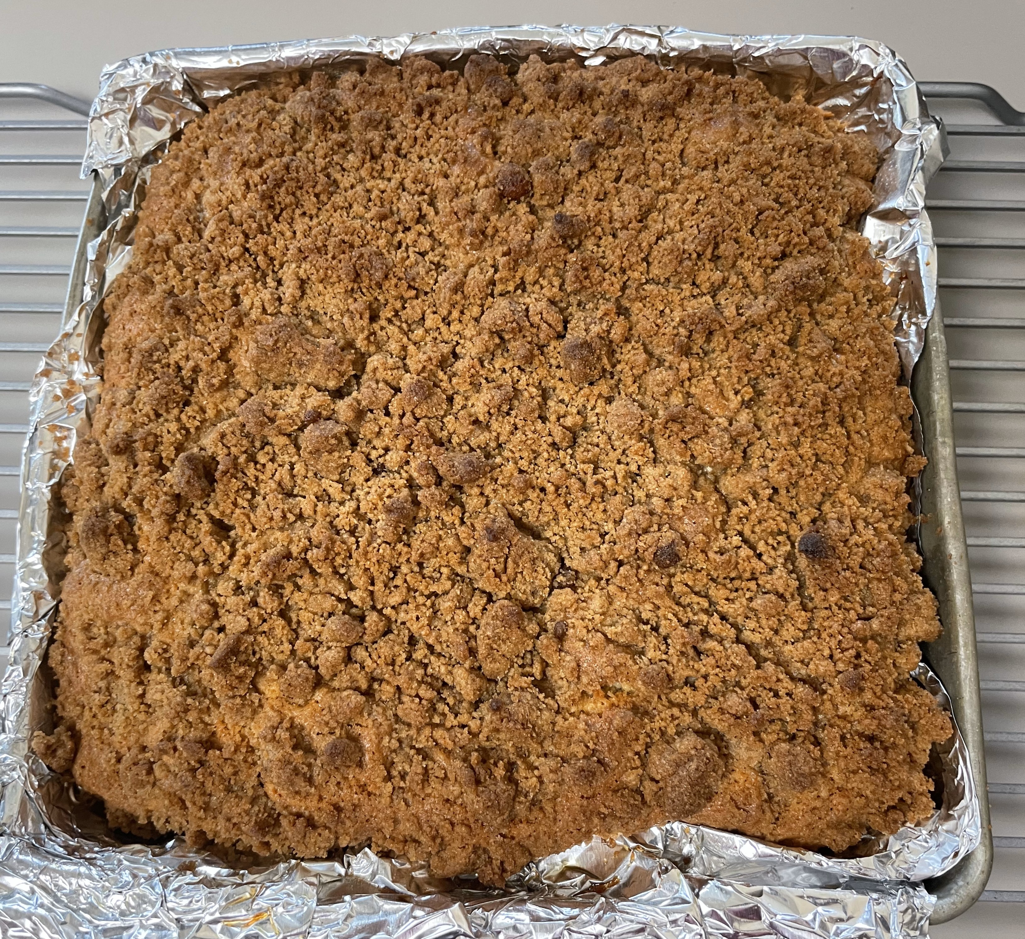 Bake the cake at 350 for about 40 minutes, or until the crumble on top is a nice golden brown.