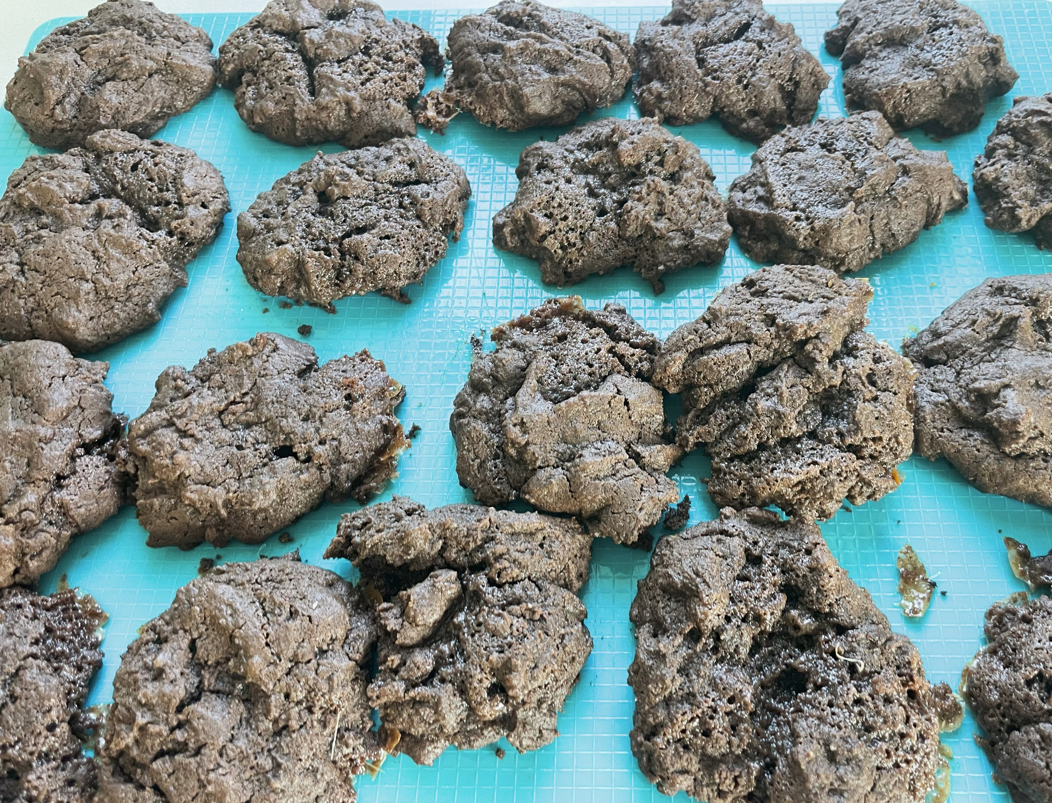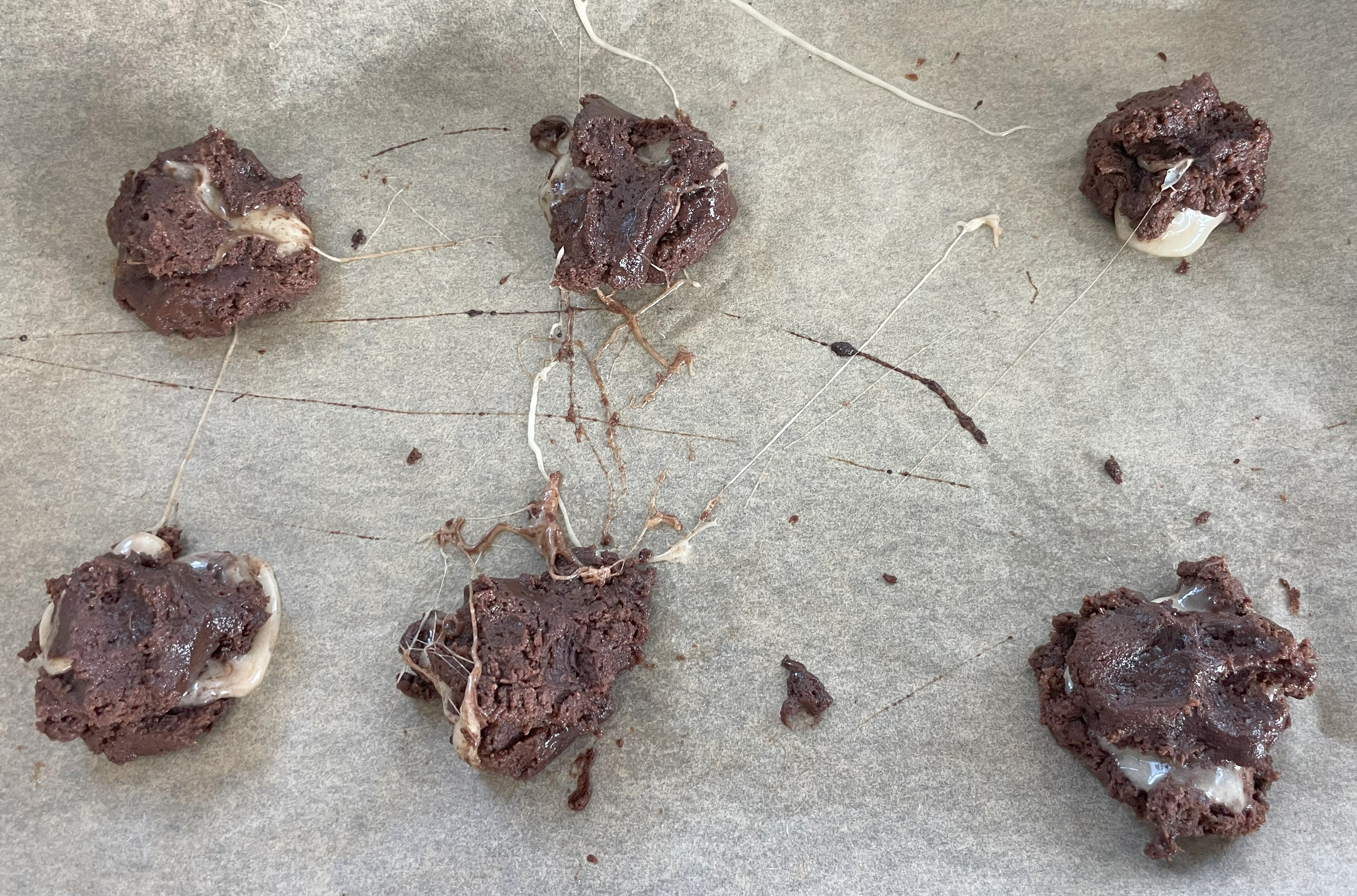 I made a different recipe chocolate marshmallow cookie a while ago, where I surrounded mini marshmallows with the dough so when you bit into the chocolate there was a marshmallow center. This time, I tried to make it so that the marshmallow swirled throughout. Didn’t actually work as planned.