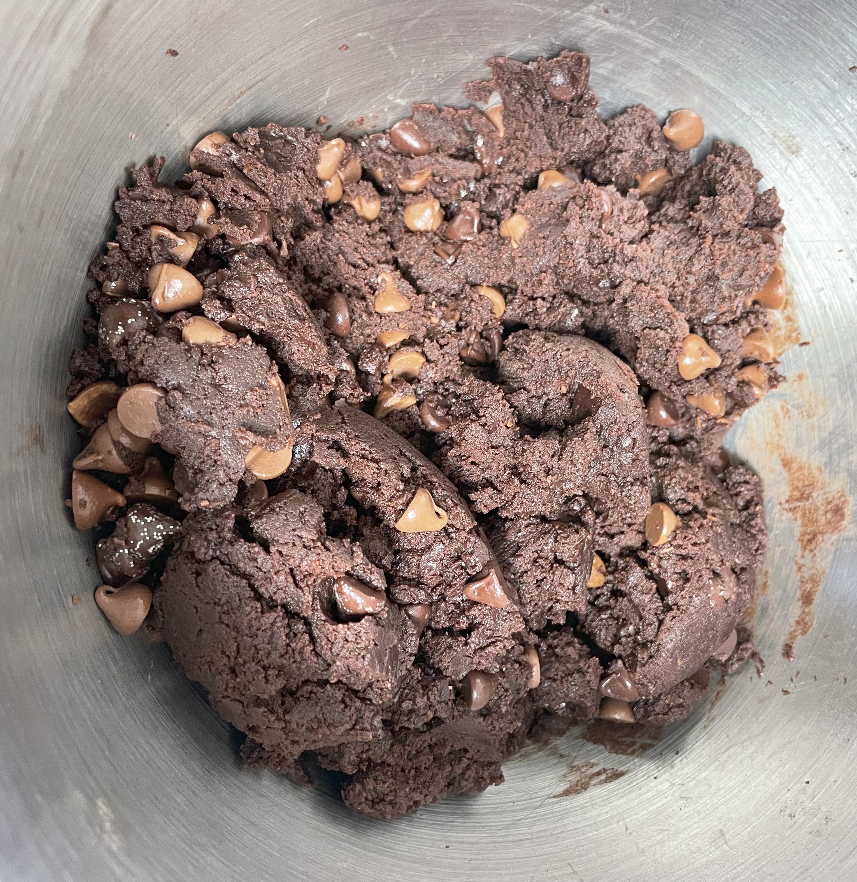 Next, get your flour mixture and slowly add that in until that’s fully combined as well. Finally, stir in all the chips until they’re well distributed.