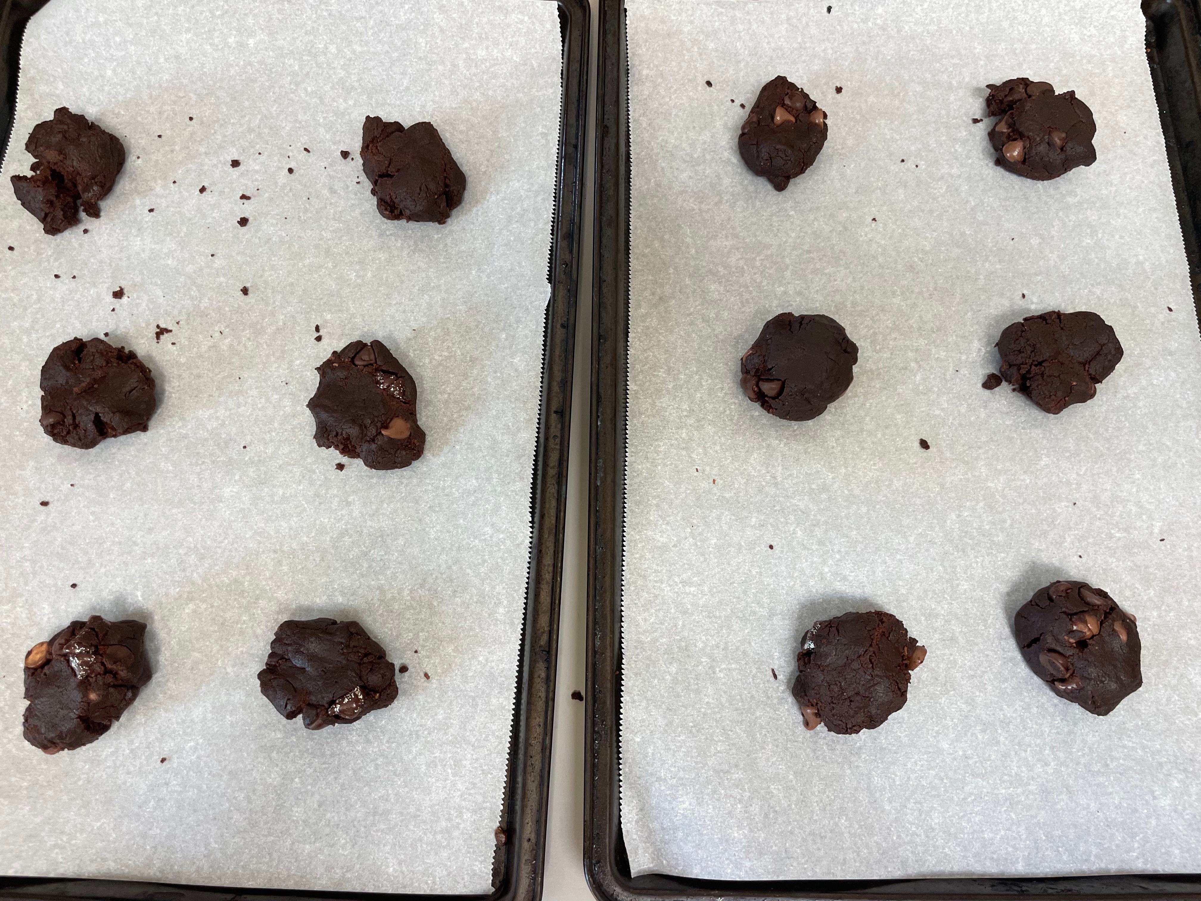 Heat the oven to 350° and drop tablespoon-sized balls onto the baking sheets lined with parchment paper, six to a sheet, and bake for about 7-9 minutes. But check as they’re cooking – you want them just starting to get a little brown on the bottom.