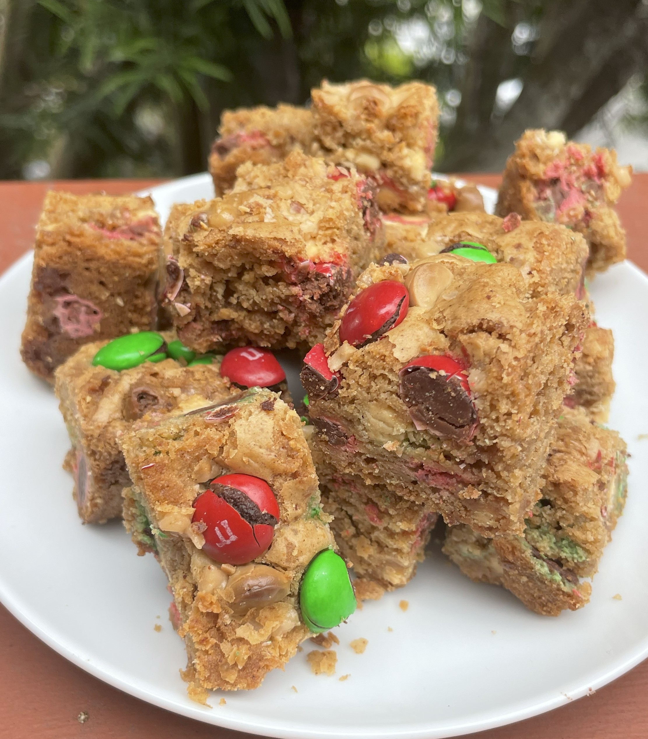 Pour this mixture into the bowl with the dry ingredients and stir until everything is well combined. Add in your white chocolate chips, toffee bits and m&m’s and stir again until they’re well distributed.