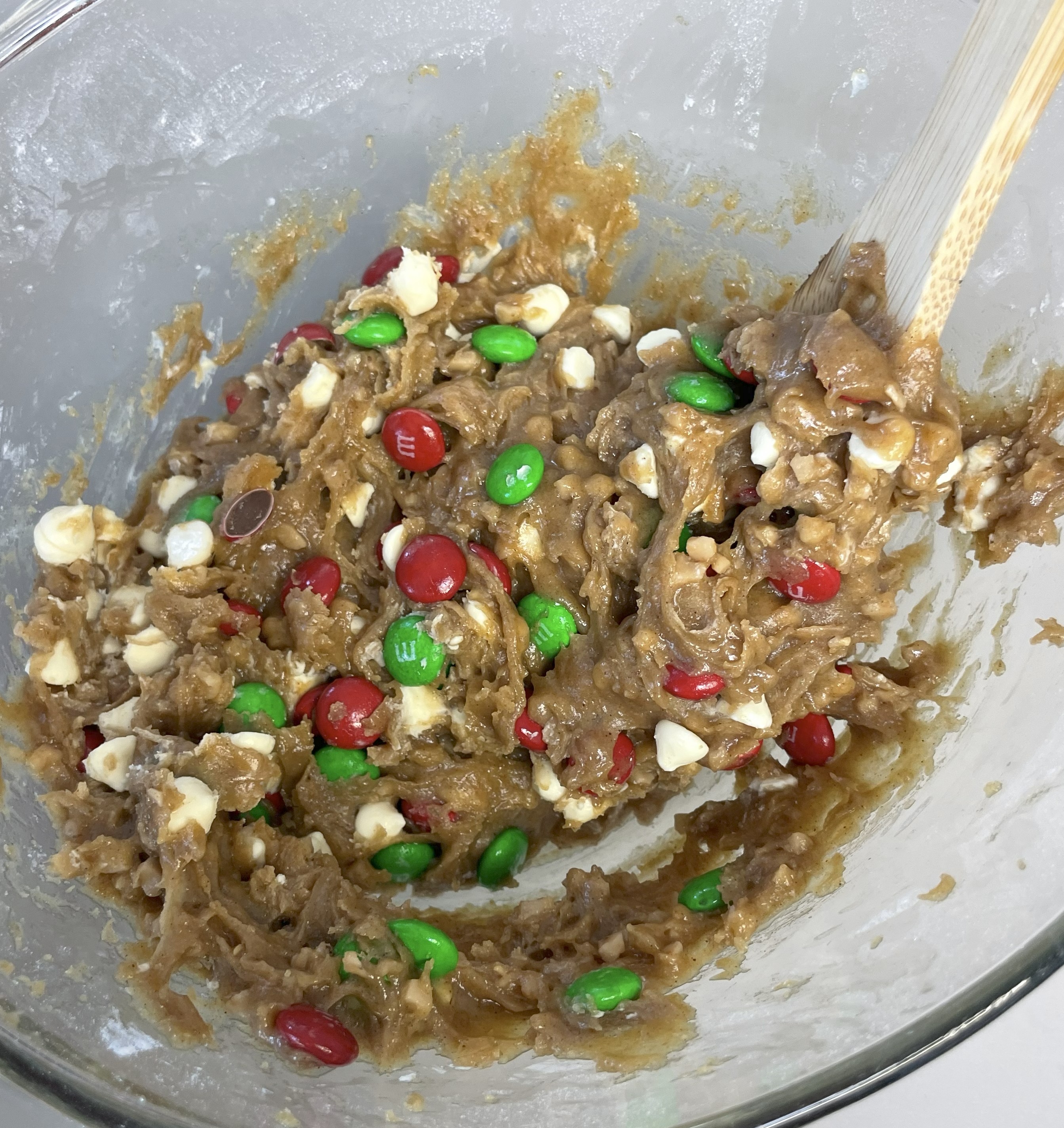 Pour this mixture into the bowl with the dry ingredients and stir until everything is well combined. Add in your white chocolate chips, toffee bits and m&m’s and stir again until they’re well distributed.