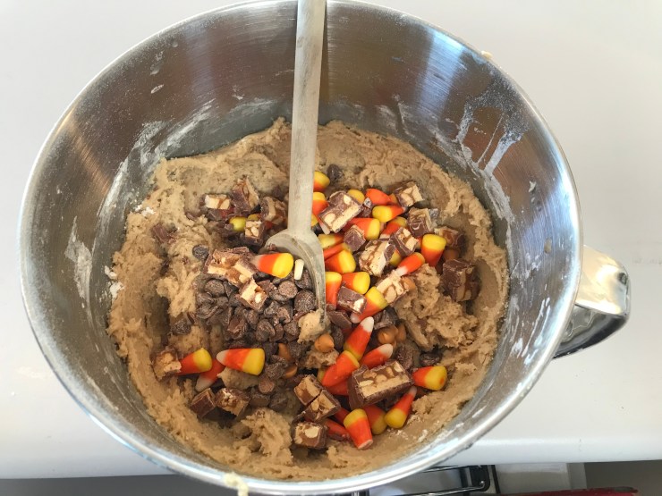 Put away your mixer, add in all your leftover candies and stir with a wooden spoon until they’re evenly distributed. Feel free to eat a couple before they get into the batter. I mean, you’re only human.