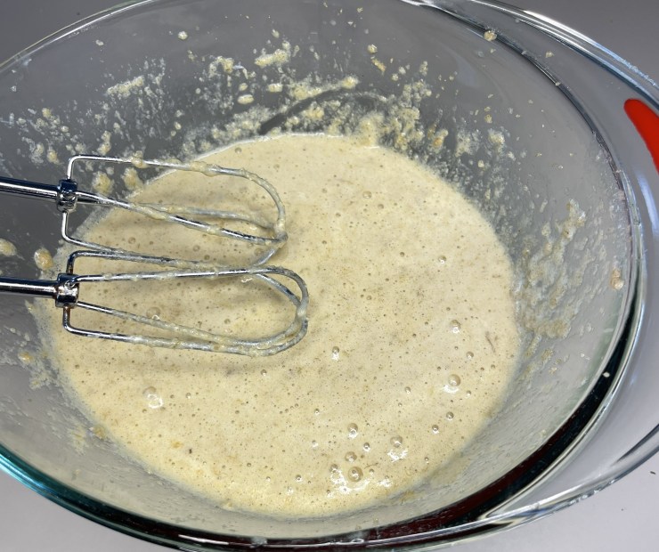 Now we’re just going to slowly add in the dry ingredients. Start with the banana crème pudding mix and mix until just combined. Then do the same with the baking soda. Finally add in the flour (not all at once or it’ll go flying everywhere) and mix until well combined.
