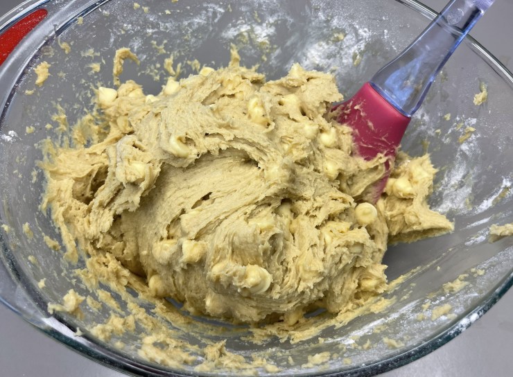 Pour in the white chocolate chips and stir (don’t mix) until well distributed. That’s it for the batter!