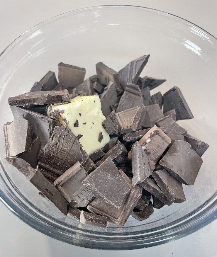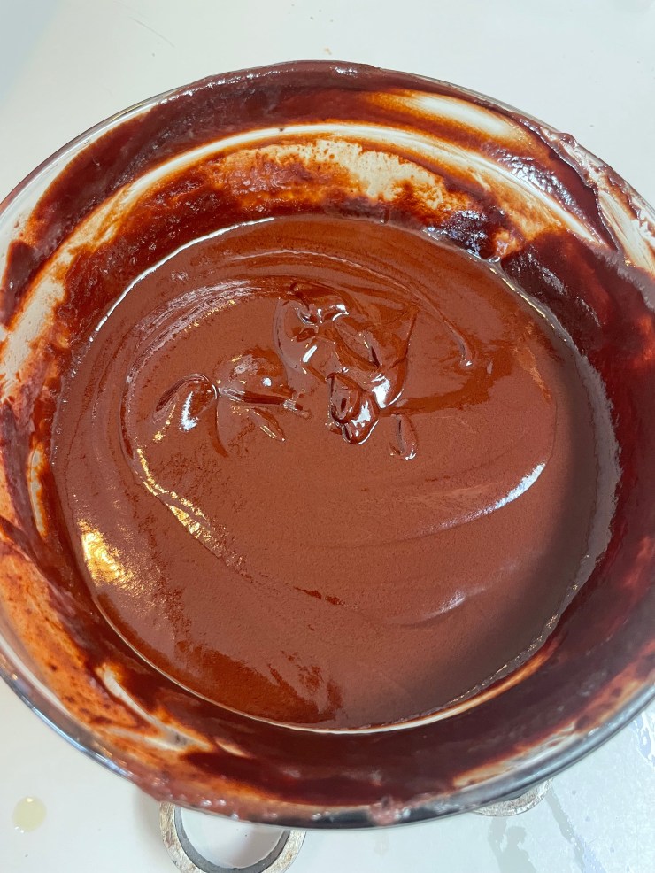 Once it does, whisk everything together until the mixture is smooth. I actually couldn’t get all my chocolate to melt, so I put the bowl into the microwave for a bit, but at 20% power – not to boil or cook it, just to get the chocolate to completely melt when I stirred it.