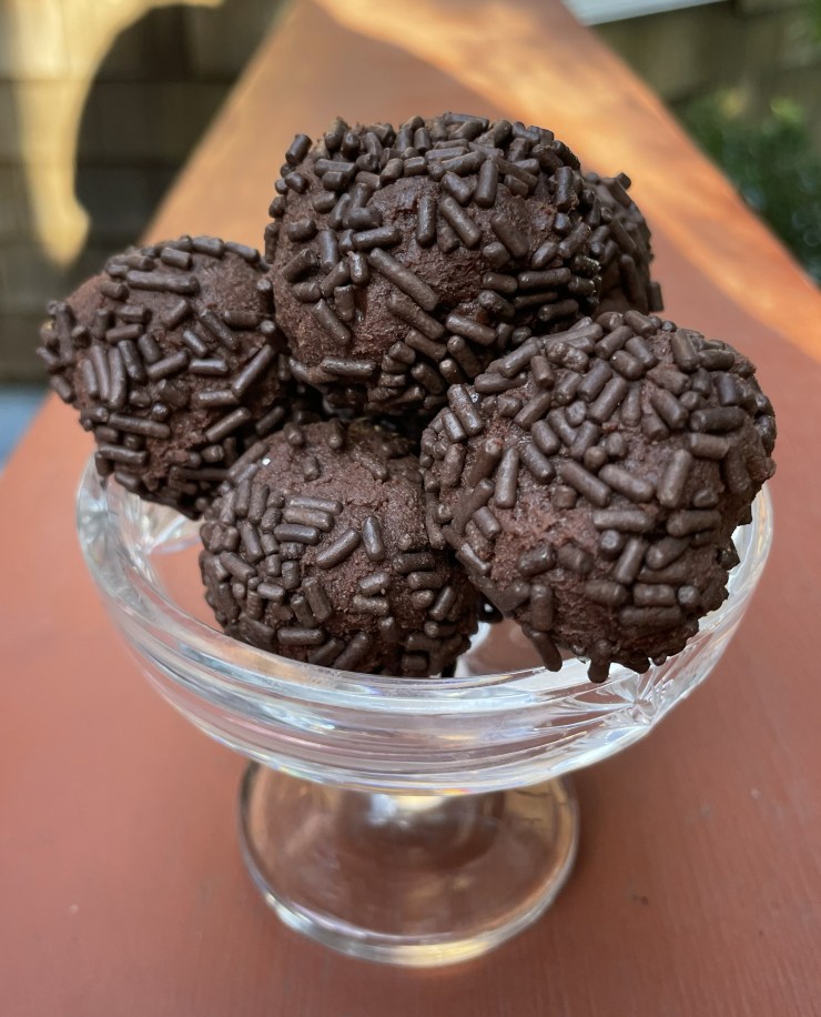 Roll up tablespoon-sized balls of chocolate in your hands, and then roll the balls in the sprinkles, making sure each one is covered.