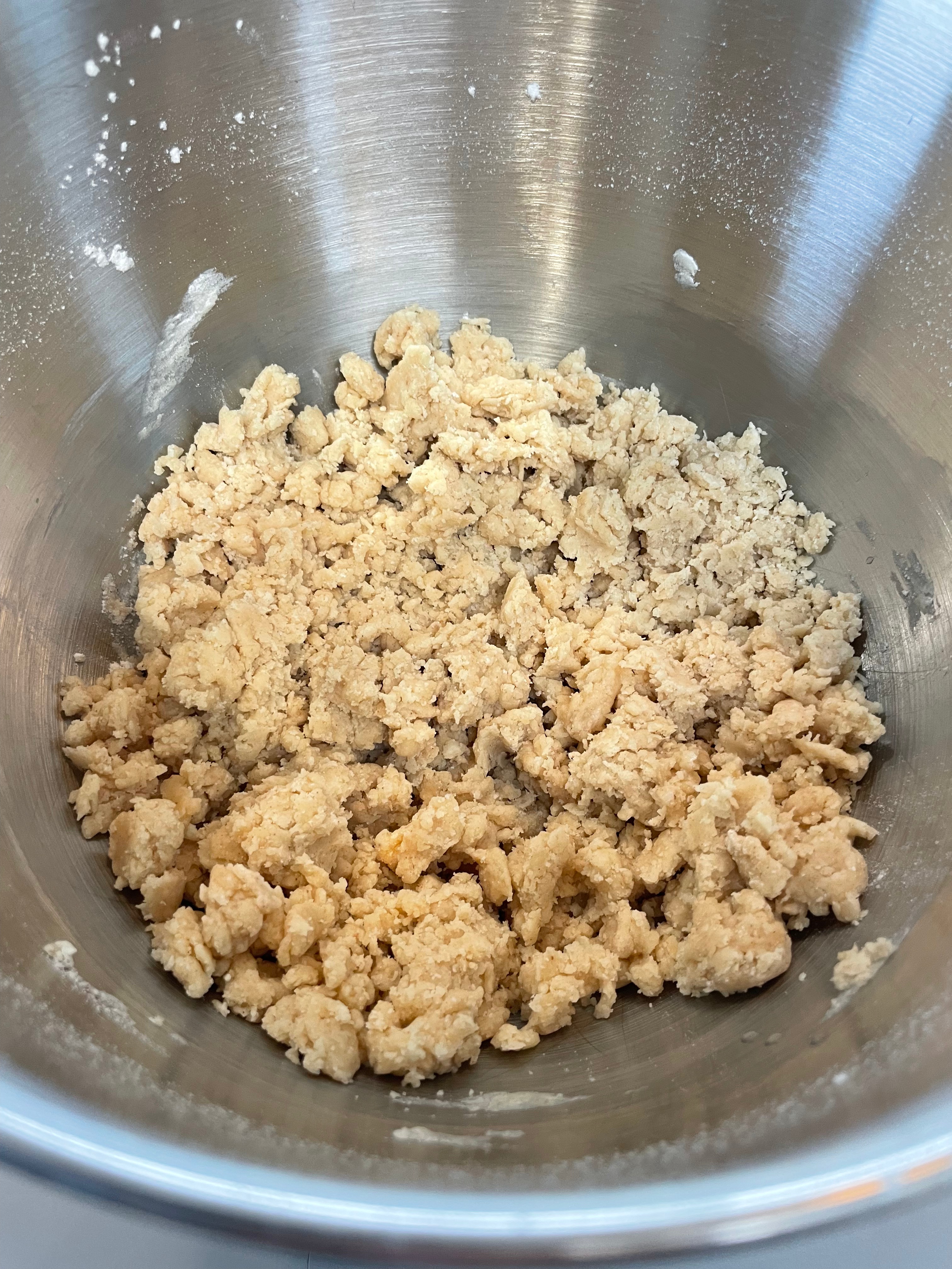 In a large bowl, add the flour, corn starch, butter, ¼ cup of the sugar, the vanilla and the salt. Gently mix until just combined. FYI, it will still be very dry and not dough-y yet.
