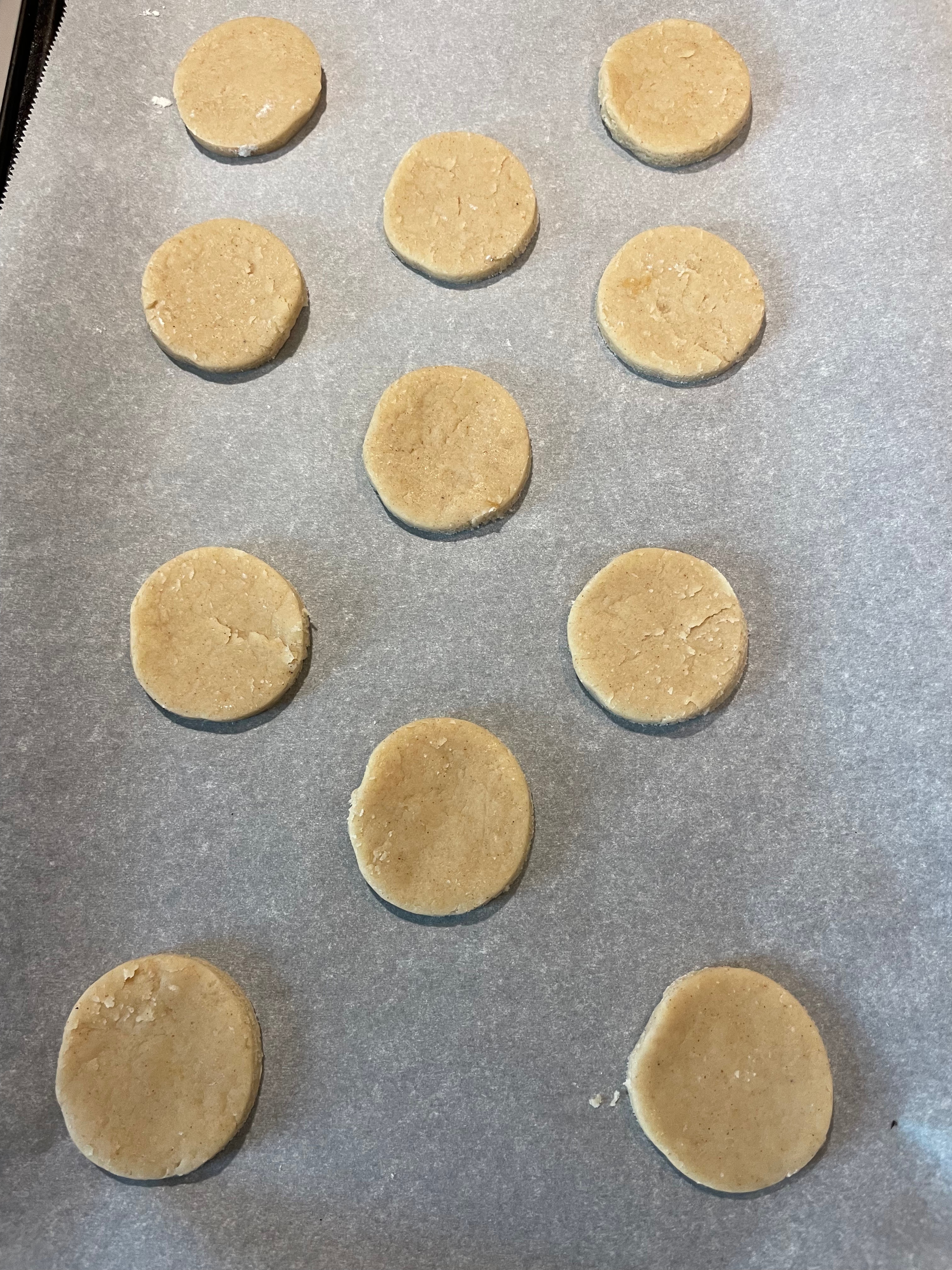 Once your dough is chilled, take it out of the fridge and roll it so that it’s about ¼ inch thick. Get a cookie cutter and cut out cookies, moving them to a baking sheet lined with parchment paper. They’ll spread a little but not too much.