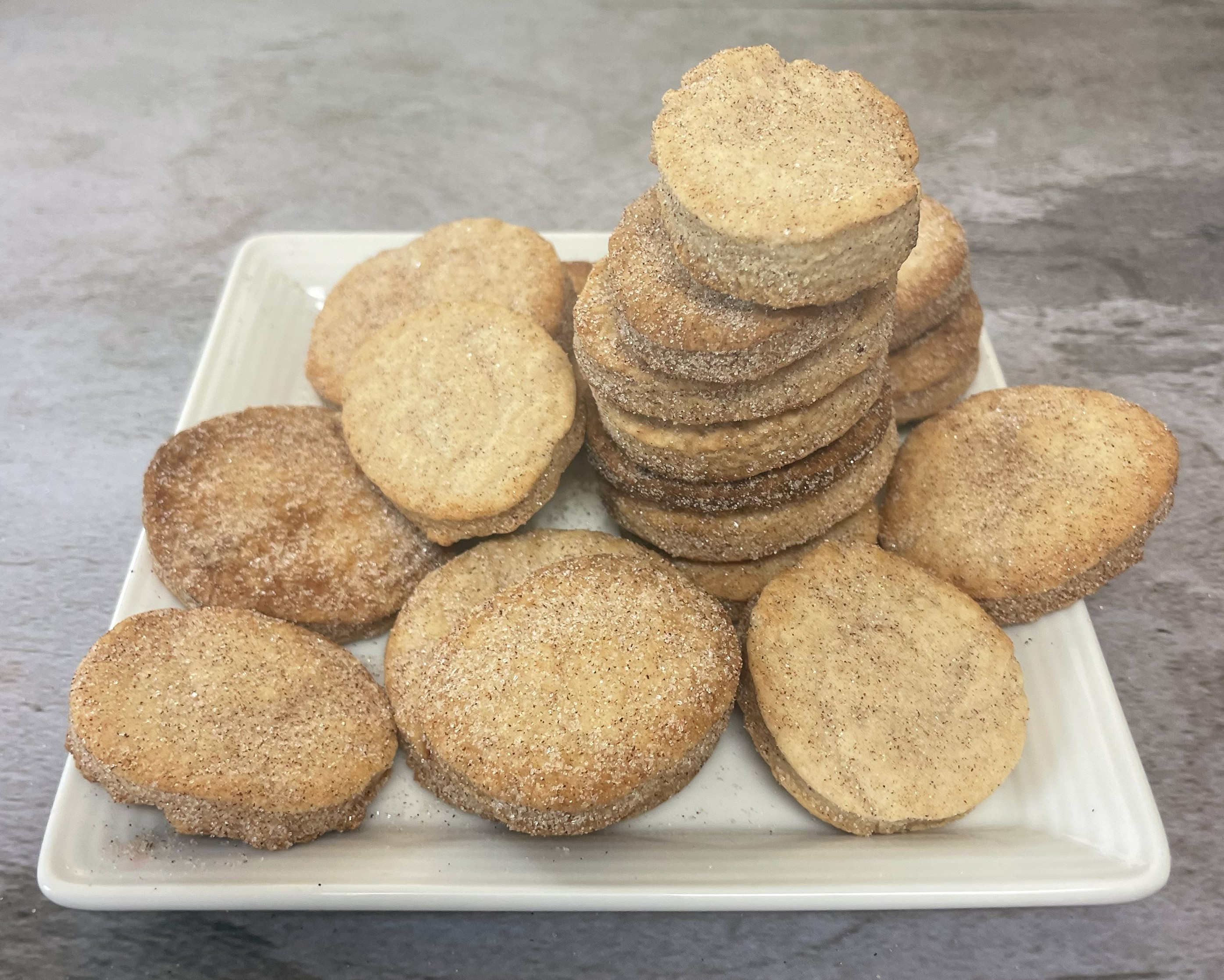When the cookies are done, take them out of the oven, dip them in the cinnamon sugar mixture while they’re still warm and move them to a wire rack to cool completely.
