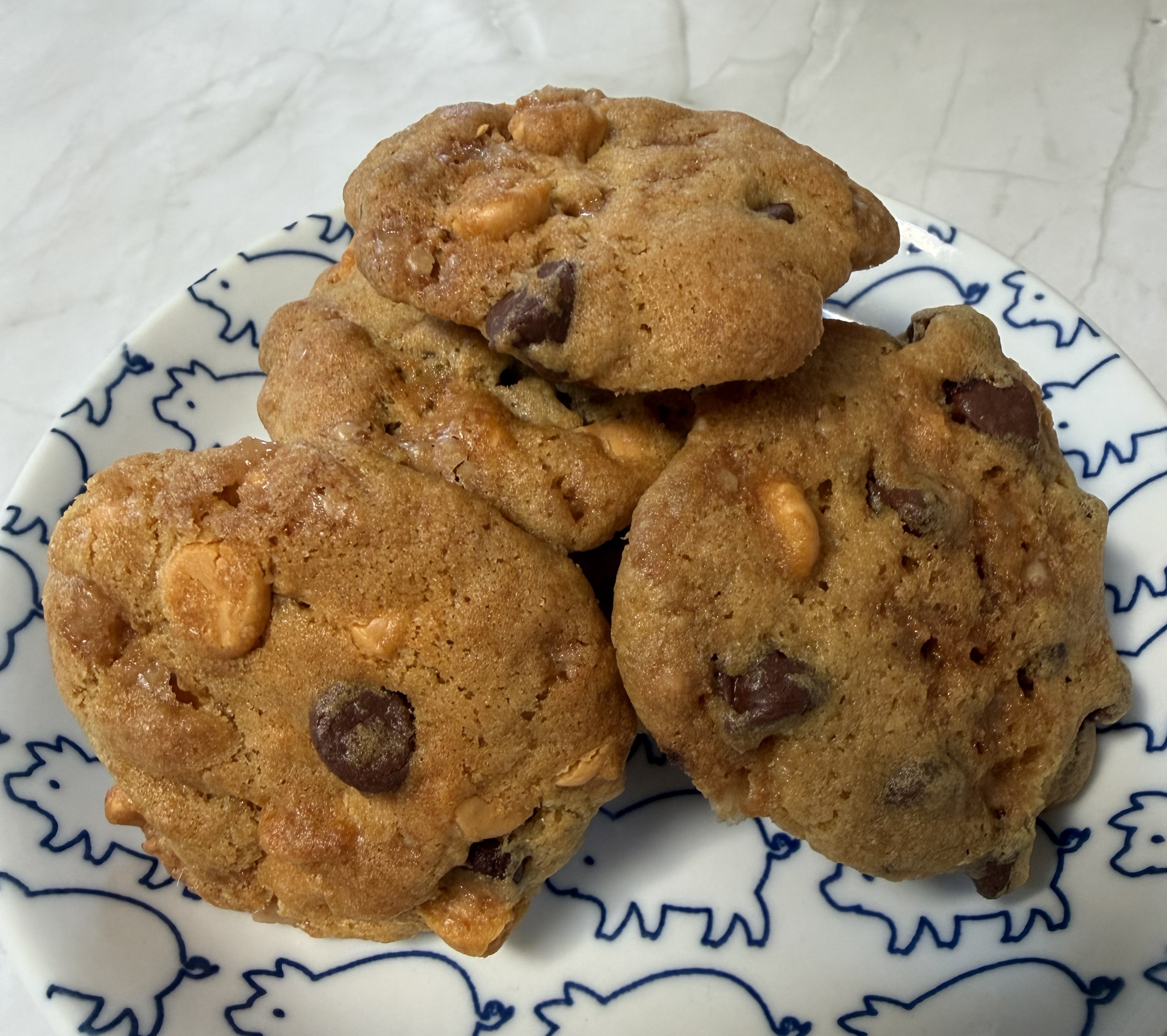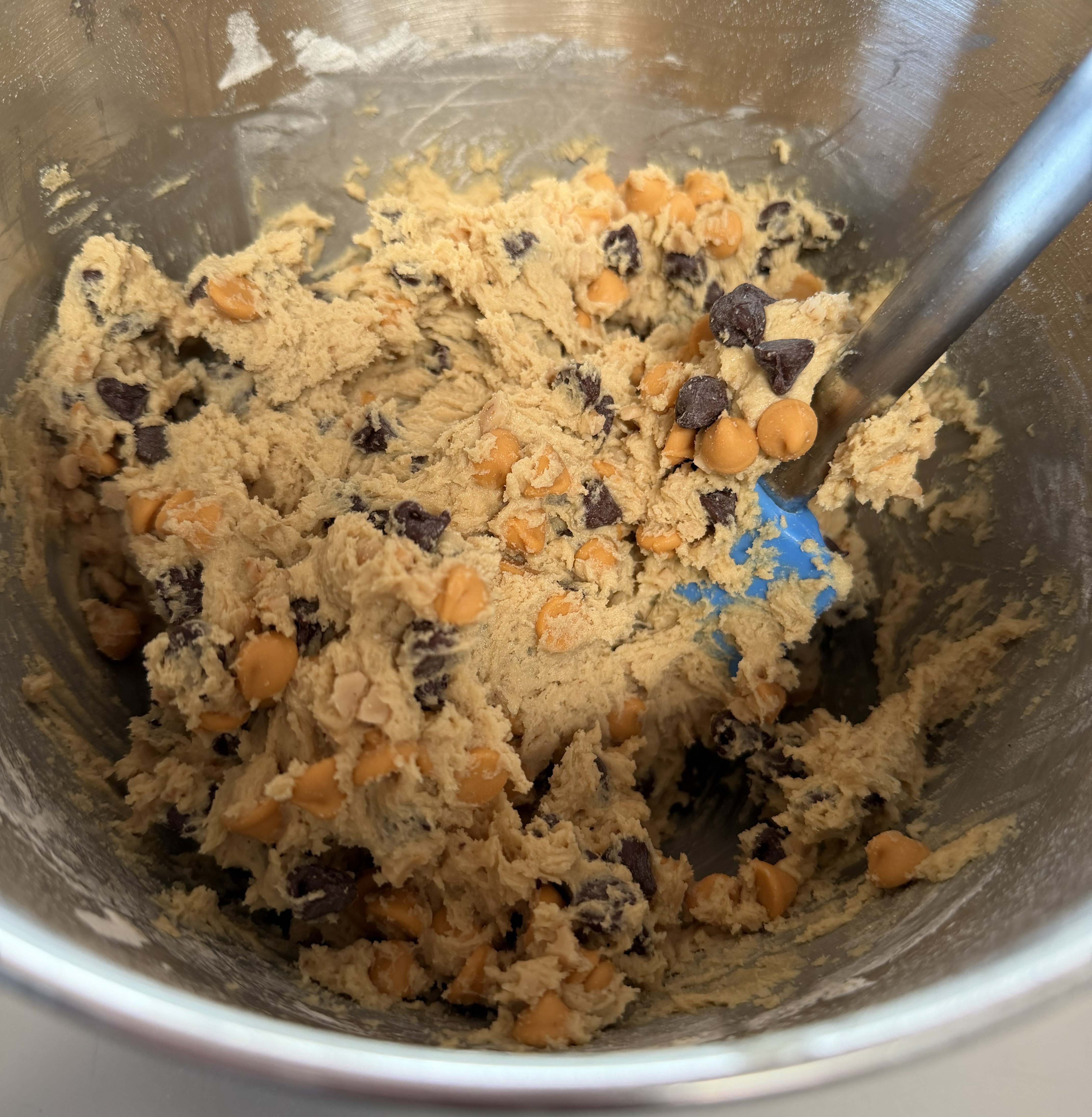 Toss in the chocolate chips, butterscotch chips and toffee bits and stir until they’re well distributed. That’s it – that’s your dough.
