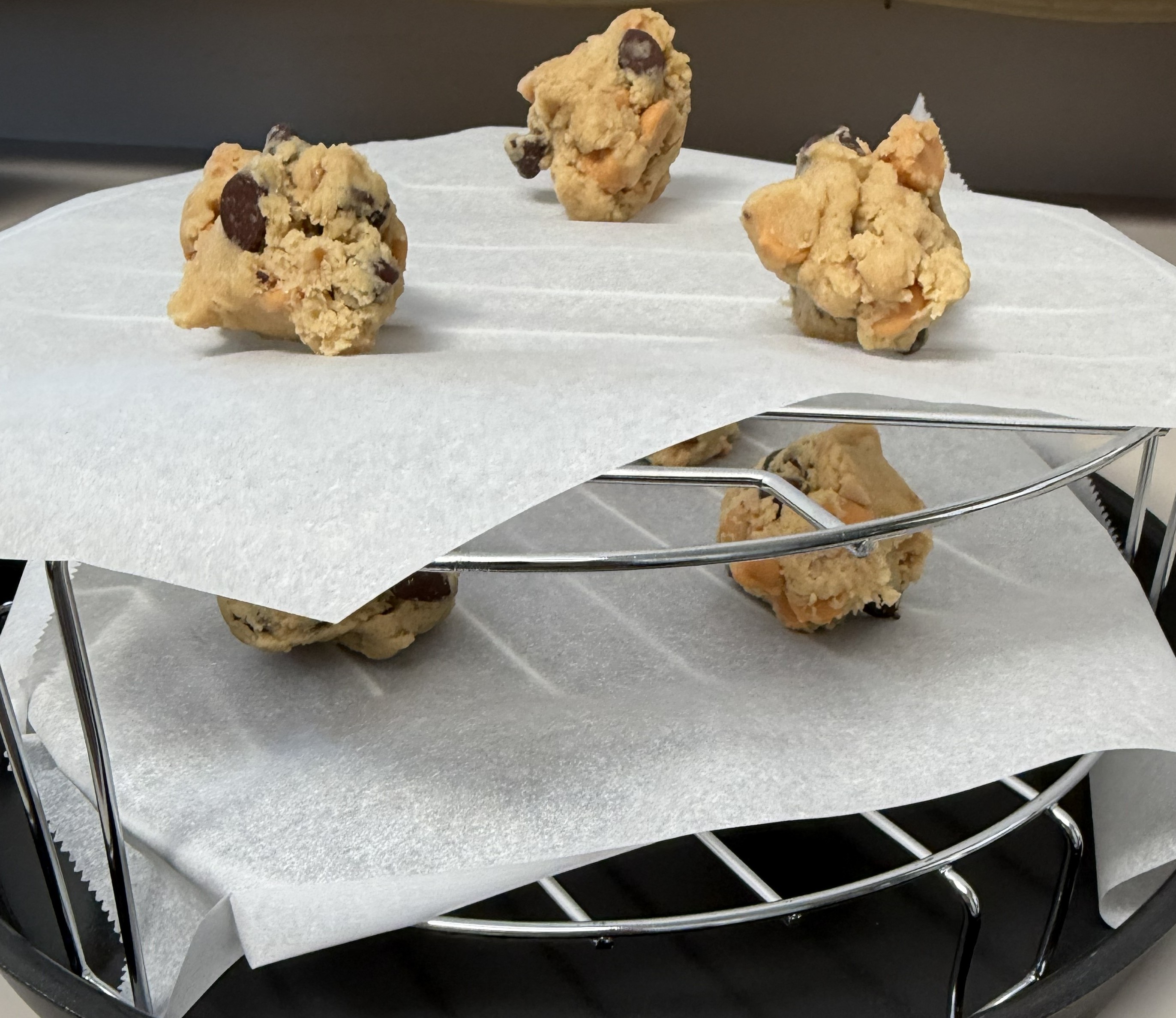 When you’re ready to bake, lay some parchment paper over the rack(s) in your air fryer. Place ping pong sized balls of dough on the paper, making sure to leave room between them because they will spread. Probably an inch and a half will do, but it’s probably best to experiment.