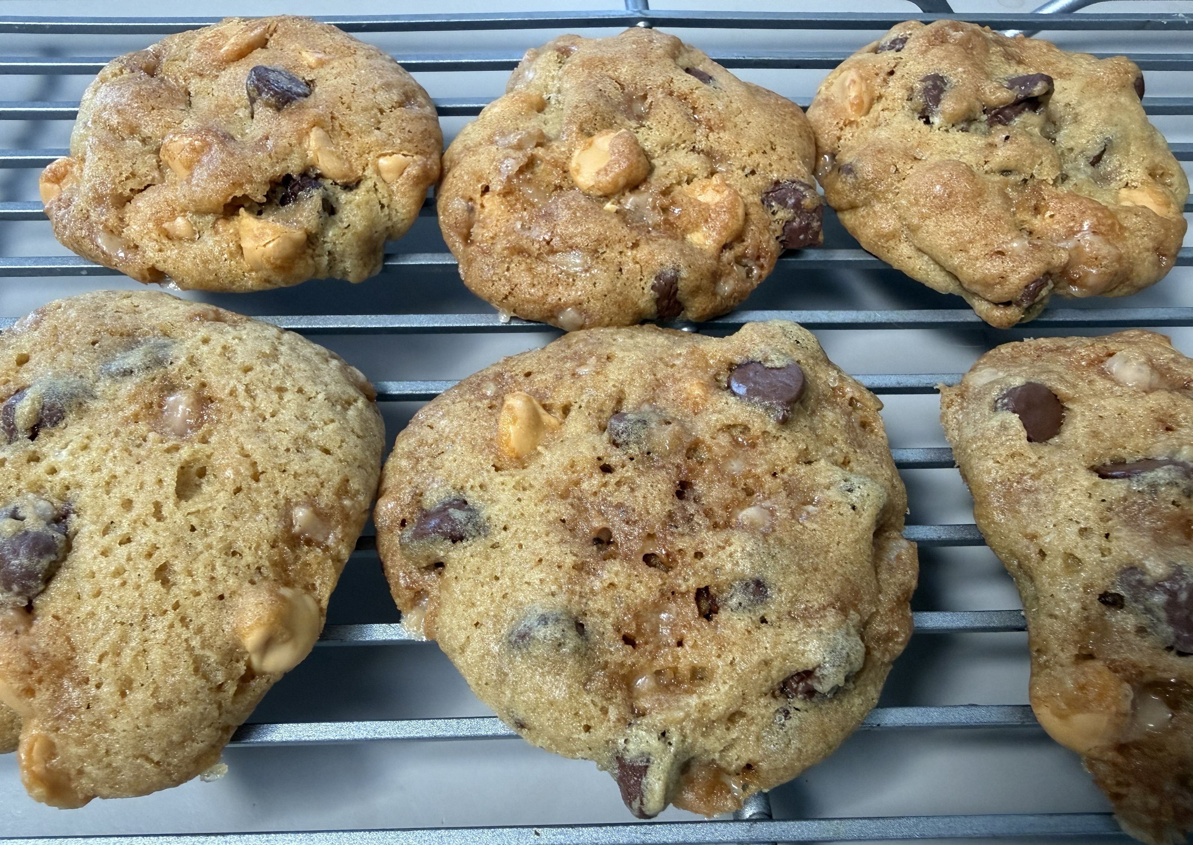 Air fry at 275 for 13-16 minutes, or until the cookies are a nice golden brown. One important thing to note when making these in a microwave/air fryer combo – the cookies on the top rack cooked quite a bit faster than those on the bottom. I took them out first and let the bottom cookies cook for an additional 4 or so minutes. Note that the 13-16 minutes referenced above takes care of the top cookies…add time for the bottom ones.
