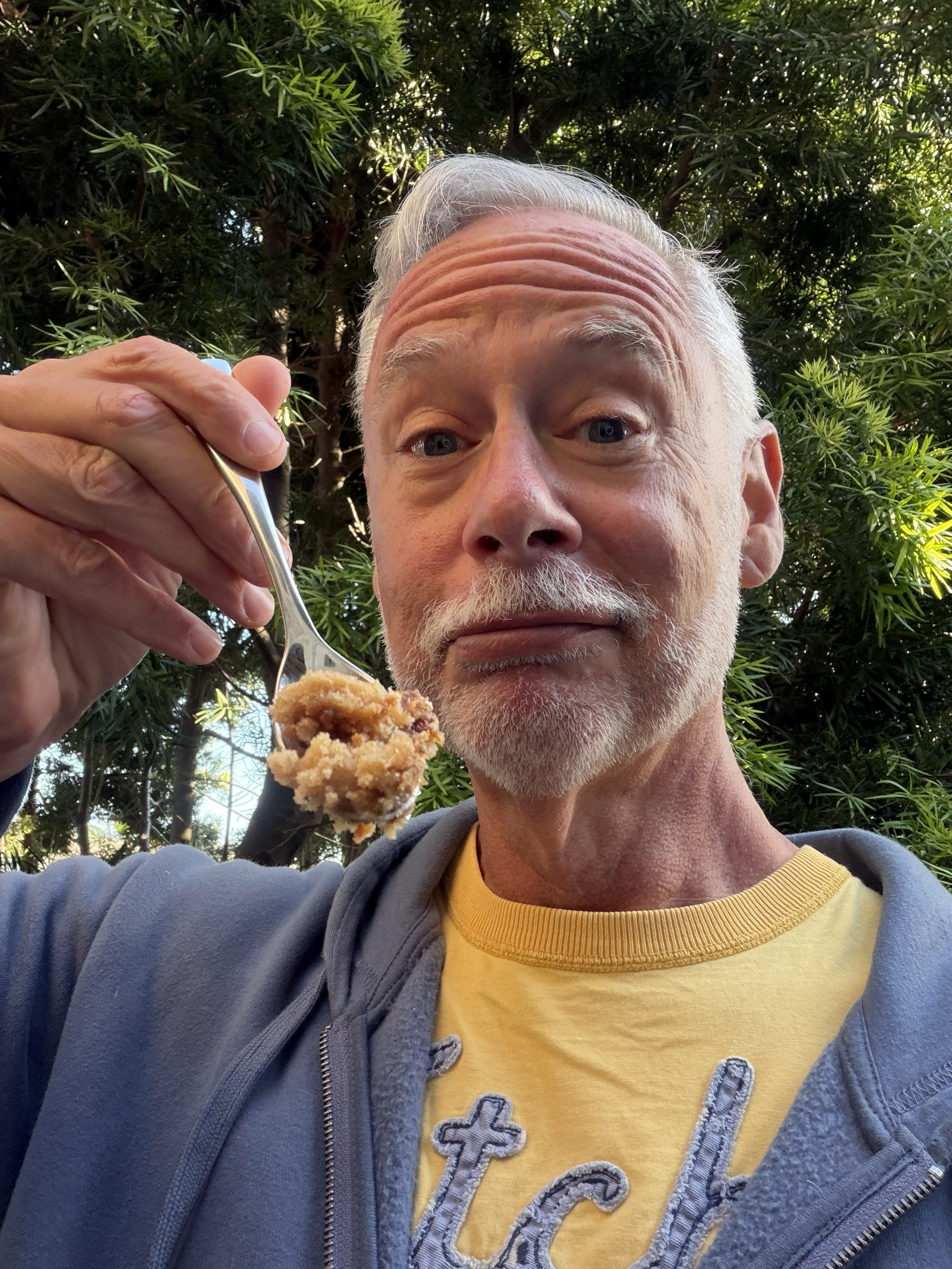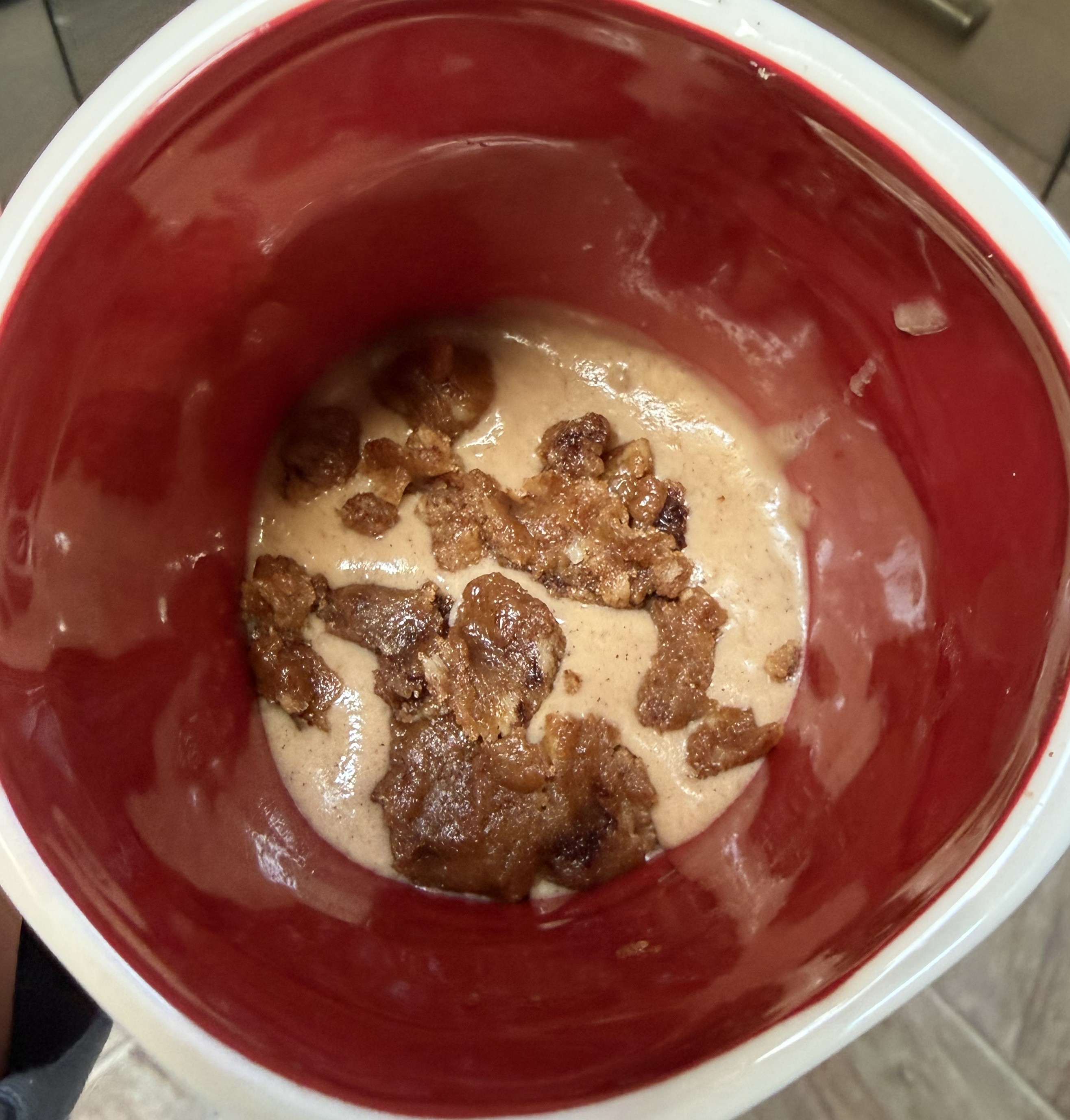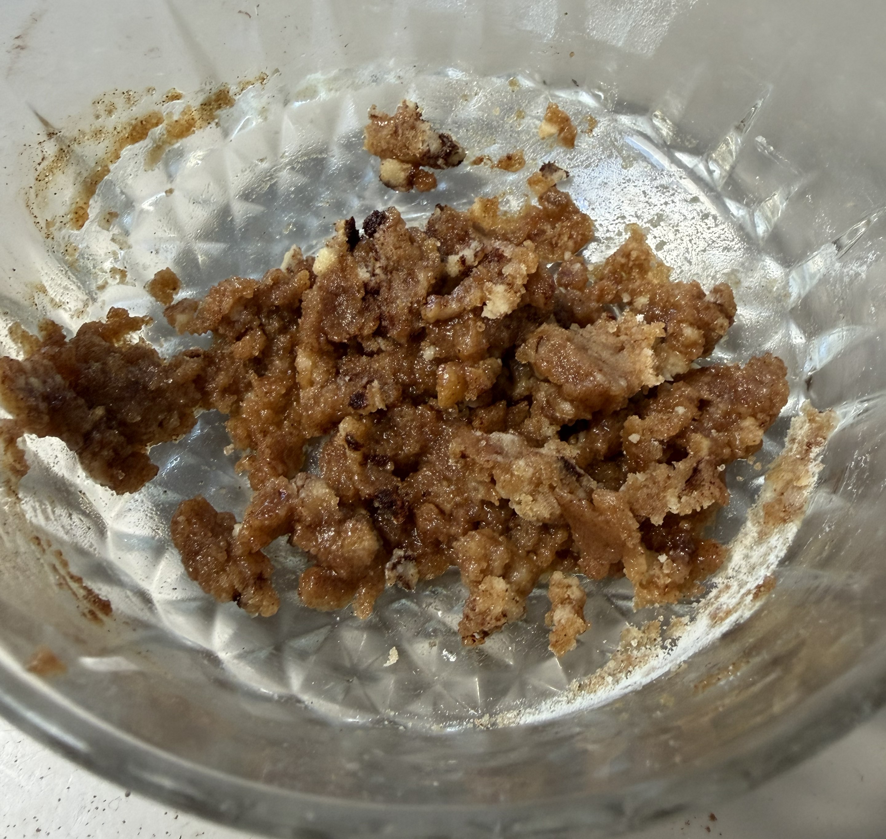 In a separate small bowl mix the remaining ingredients: 1 T flour, 1 T brown sugar, ¼ t cinnamon, ½ T butter and ½ t vanilla. Mix with a fork until crumbly (you might want/need to use your fingers for this – you want it to end up looking like little pebbles.)