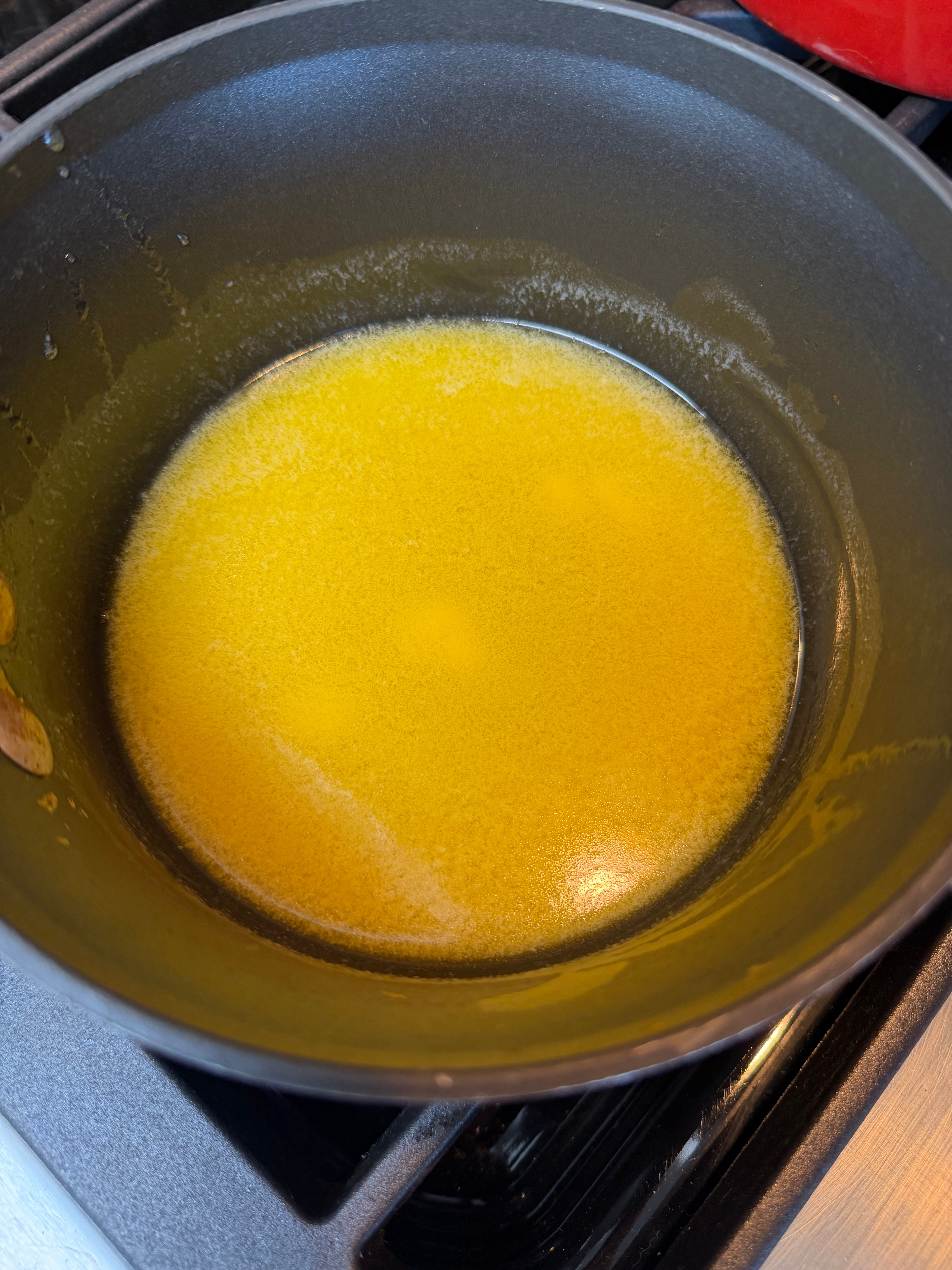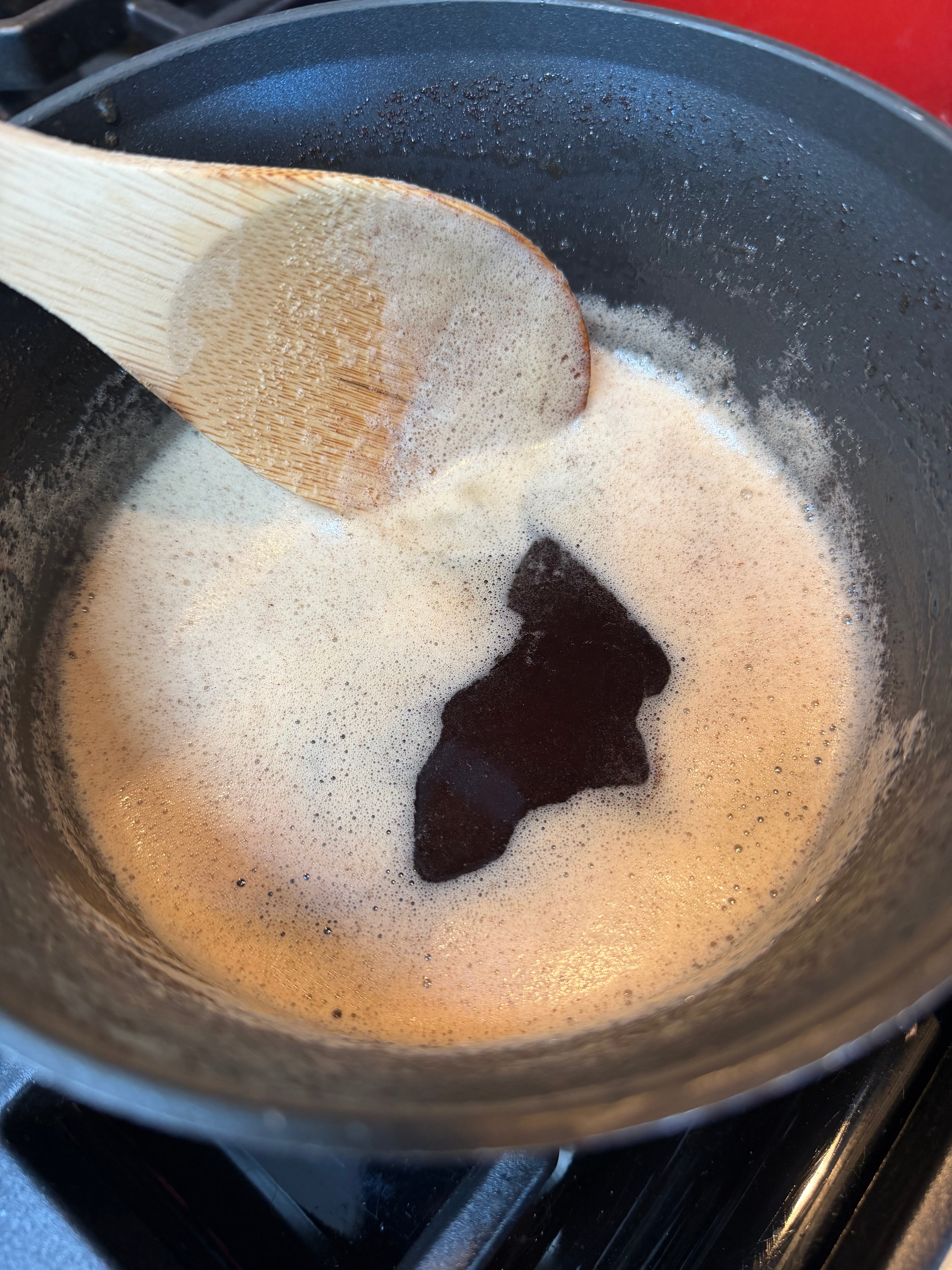 We’ll start with the most difficult part (which really isn’t that difficult) – browning your butter.Put your butter into a saucepan and heat over a low heat, stirring regularly. After a bit it will start to change color, getting amber then brownish – once it starts turning color, stir the butter continuously so it doesn’t burn.