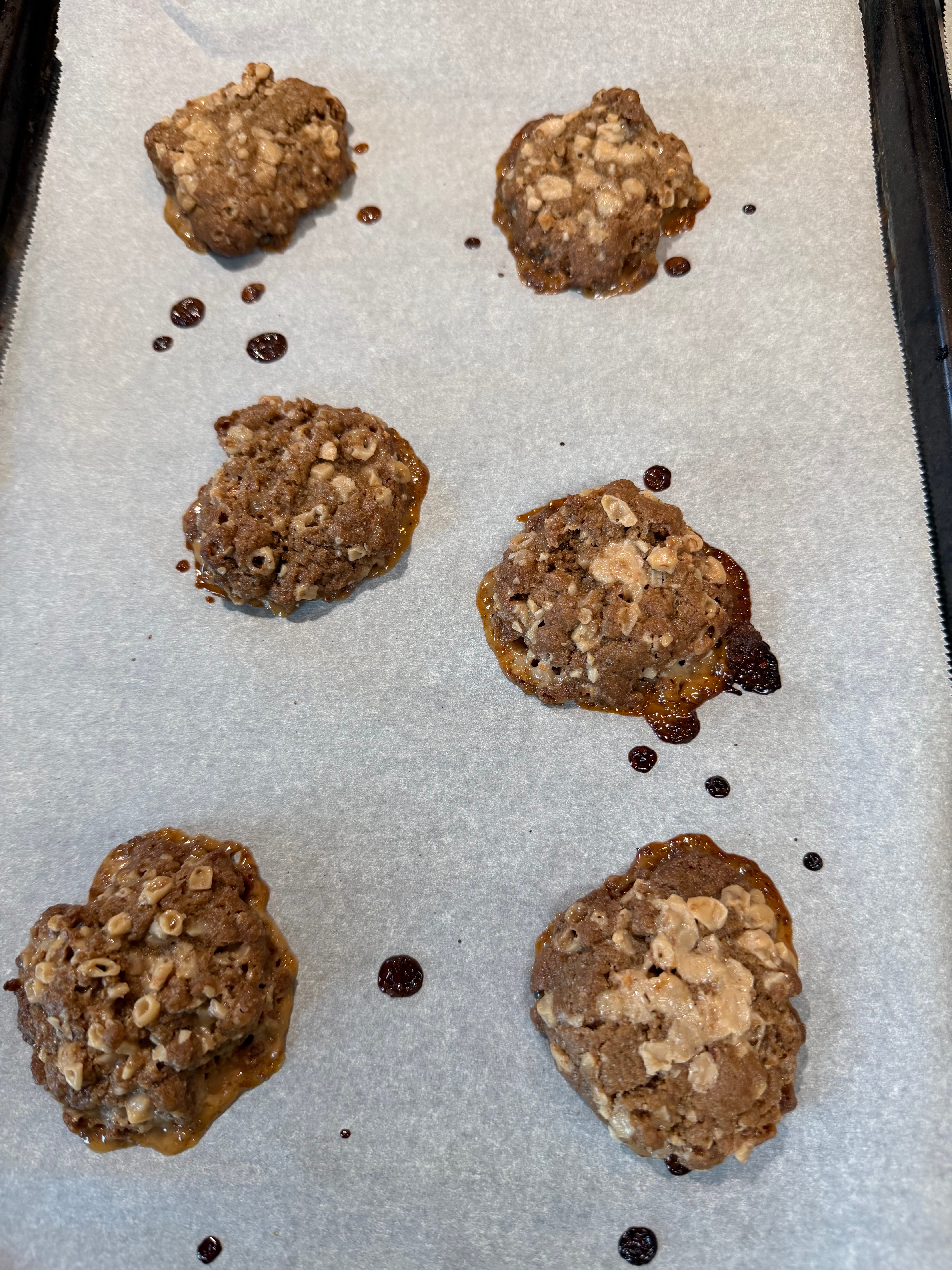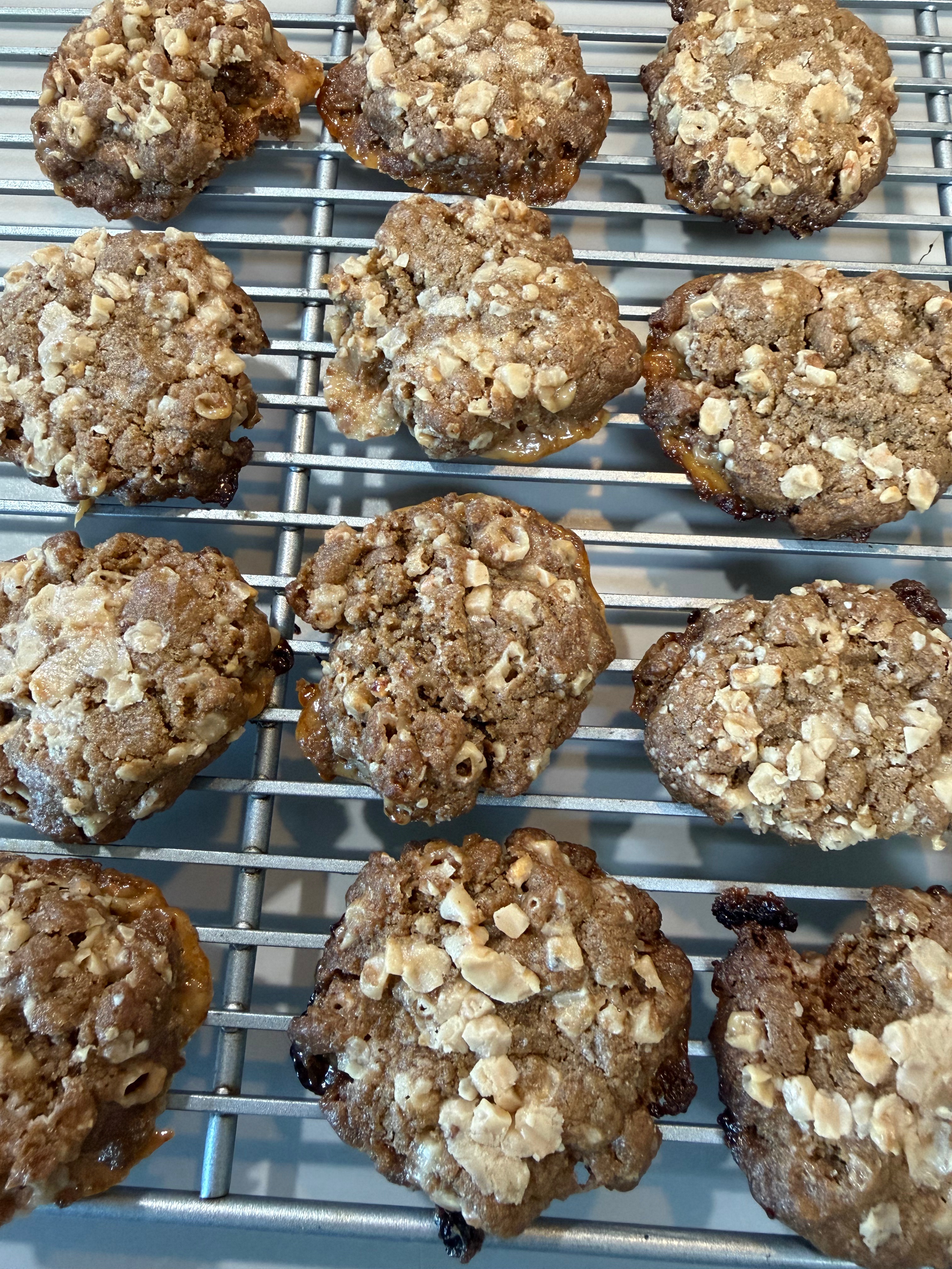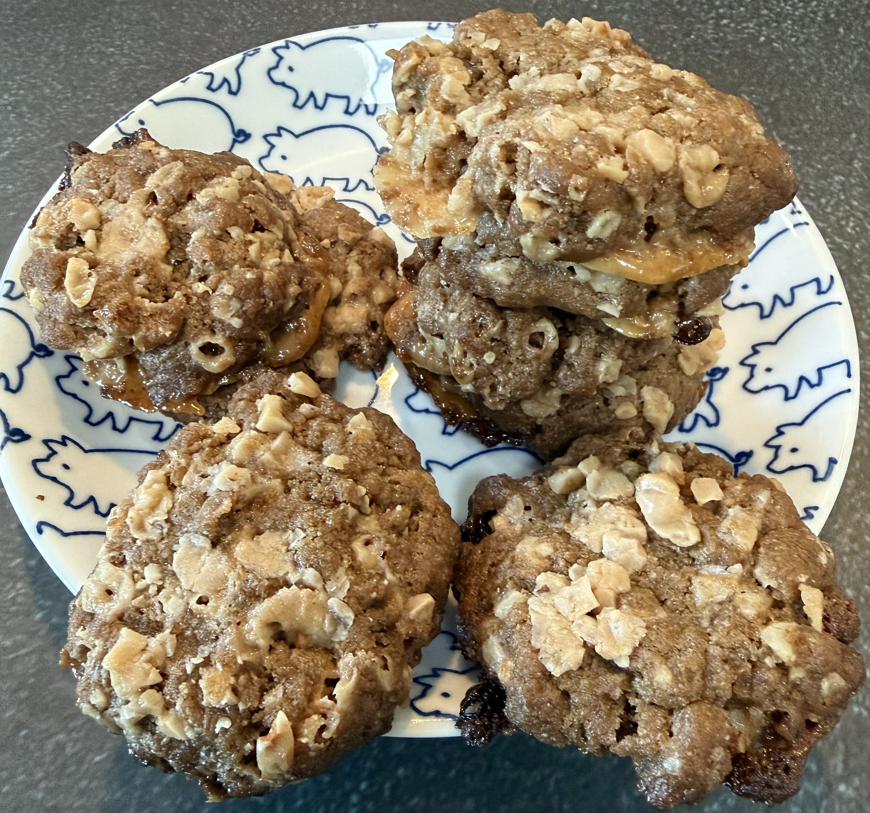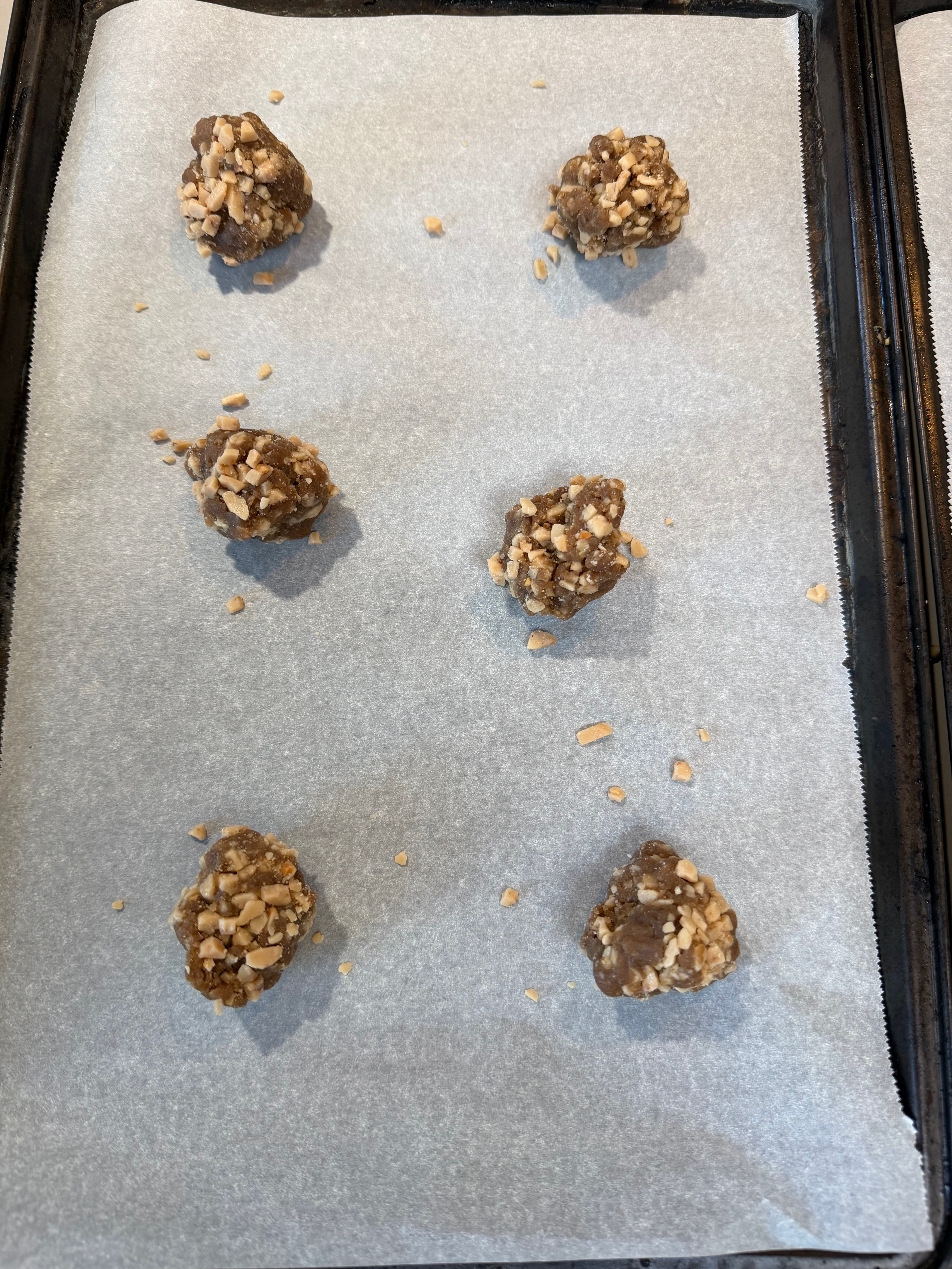 Roll up ping-pong sized balls of dough and roll them in the bowl of toffee bits. Place them on your prepared baking sheets, 6 to a sheet.